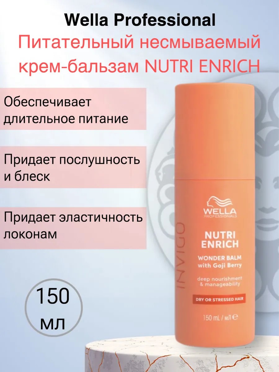 Wella Invigo Nutri-Enrich Wonder Balm. This nourishing cream-balm gives tired, dry hair healthy shine and elasticity. Its rich, leave-in formula penetrates deep into the hair, nourishing it from the inside. Multiple benefits for gorgeous hair in one bottle. With the Nutri-Enrich-Blend formula: Oleic acid and panthenol provide hydration and nutrition, while vitamin E protects hair from further damage. Goji berries are a rich source of vitamins, minerals, and peptides. Directions: Apply to damp hair along the lengths and ends. Do not rinse. Style as usual. 150 ml.