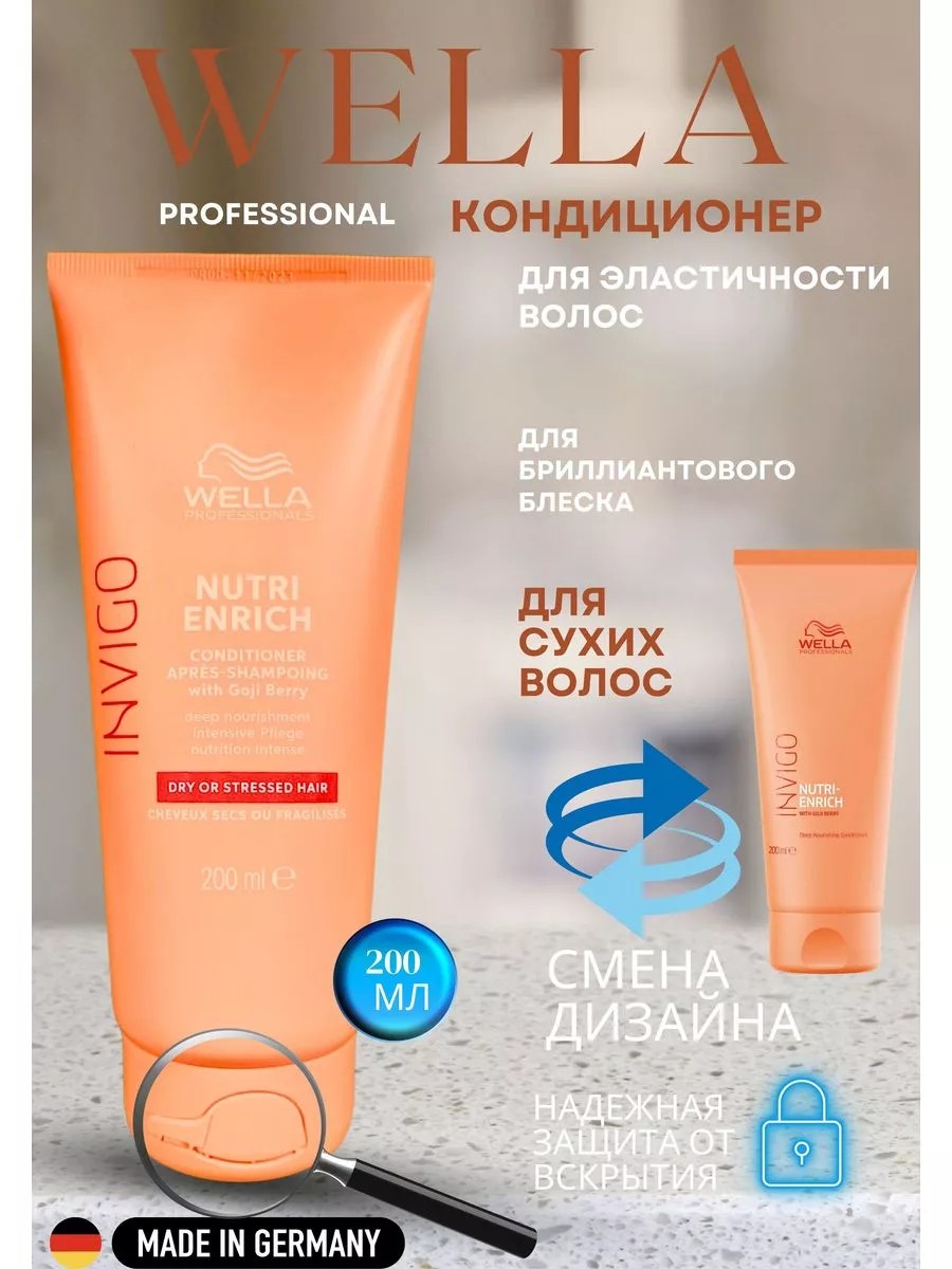 Wella Professionals Invigo Nutri-Enrich Deep Nourishing Conditioner. Wella Professionals Invigo Nutri Enrich Deep Nourishing Conditioner instantly moisturizes dry, stressed hair, adding elasticity and vitality. With the Nutri-Enrich Blend formula: Oleic acid and panthenol provide hydration and nutrition, while vitamin E protects hair from further damage. Goji berries are a rich source of vitamins, minerals, and peptides. Instantly moisturizes dry, stressed hair, adding elasticity and vitality. Oleic acid and panthenol provide hydration and nutrition, while vitamin E protects hair from further damage. Goji berries are a rich source of vitamins, minerals, and peptides. Directions: Apply evenly to clean, damp hair. Rinse thoroughly.