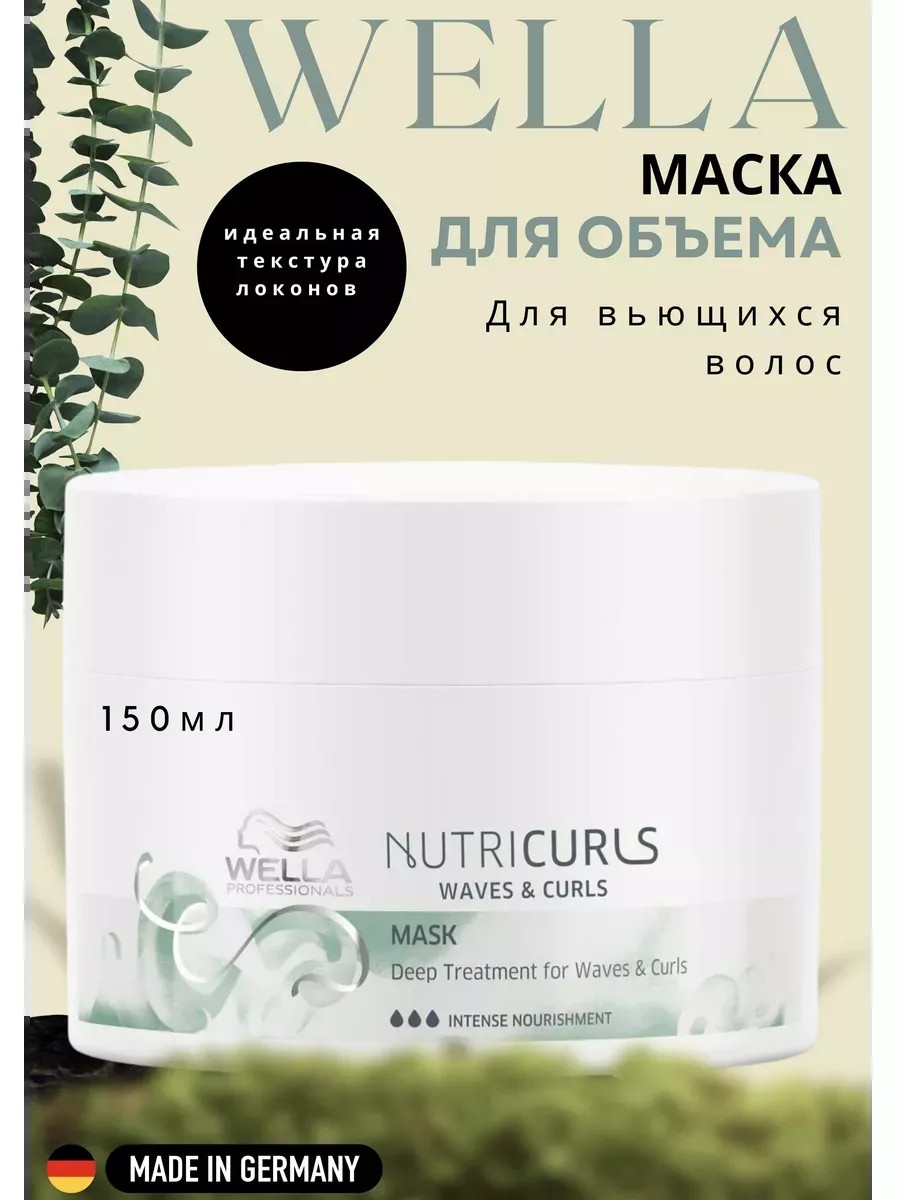 This mask intensely nourishes, softens, and adds elasticity to curly and wavy hair. It makes curls manageable and bouncy. Directions: Apply to clean, damp hair and distribute evenly. Rinse thoroughly. This hair product is used by professionals in beauty salons, meaning it's recognized and loved by hairdressers. Professional care at home. This mask from Wella Professionals, specially designed for curly hair, deeply moisturizes, leaves strands soft and manageable, and makes styling easier. Thanks to the strong nourishing properties of this product, curls are easily formed into beautiful curls, retain their shape for a long time and do not frizz. Features of Nutricurls Mask from Wella Professionals: - deeply nourishes and moisturizes the hair shaft thanks to jojoba and wheat germ oils; - smoothes and softens strands; - facilitates the formation of curls; - vitamin E helps restore the hair cuticle, adds shine and volume; - simplifies styling and combing; - provides a cumulative effect and a positive result; - has a delicate aroma and silky consistency; - with regular use, curls become smooth and dense; - does not weigh strands down; - is easily distributed through the hair. Ingredients: Aqua/Water/Eau, Stearyl Alcohol, Behentrimonium Chloride, Cetyl Alcohol, Parfum/ Fragrance, Benzyl Alcohol, Phenoxyethanol, Isopropyl Alcohol, Propylene Glycol, Quaternium-80, Methylparaben, Propylparaben, Disodium EDTA, Panthenol, Linalool, Hexyl Cinnamal, Limonene, Geraniol, Citronellol, Simmondsia Chinensis (Jojoba) Seed Oil, Cetearyl Nonanoate, Citric Acid, Ethylhexyl Isononanoate, Triticum Vulgare (Wheat) Germ Oil, Triticum Vulgare Bran Extract, Linoleic Acid, Camellia Oleifera Seed Oil, Tocopherol.