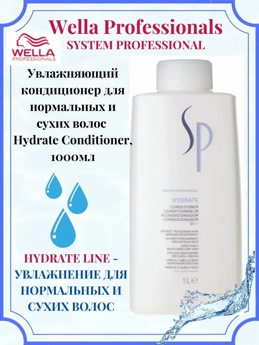 The SP System Professional Hydrate Conditioner from Wella is specially formulated to moisturize and restore brittle hair. This conditioner guarantees hydration, nourishment, and silkiness. Active ingredients and oils strengthen and soften hair. It facilitates combing and protects against the damaging effects of heat and UV radiation. Regular use leaves hair looking well-groomed. Glycerin and glucose prevent breakage, adding vitality and shine. Directions: Apply after shampooing to damp hair, massage in, and leave on for 1-2 minutes. Rinse thoroughly with running water. Suitable for daily use.