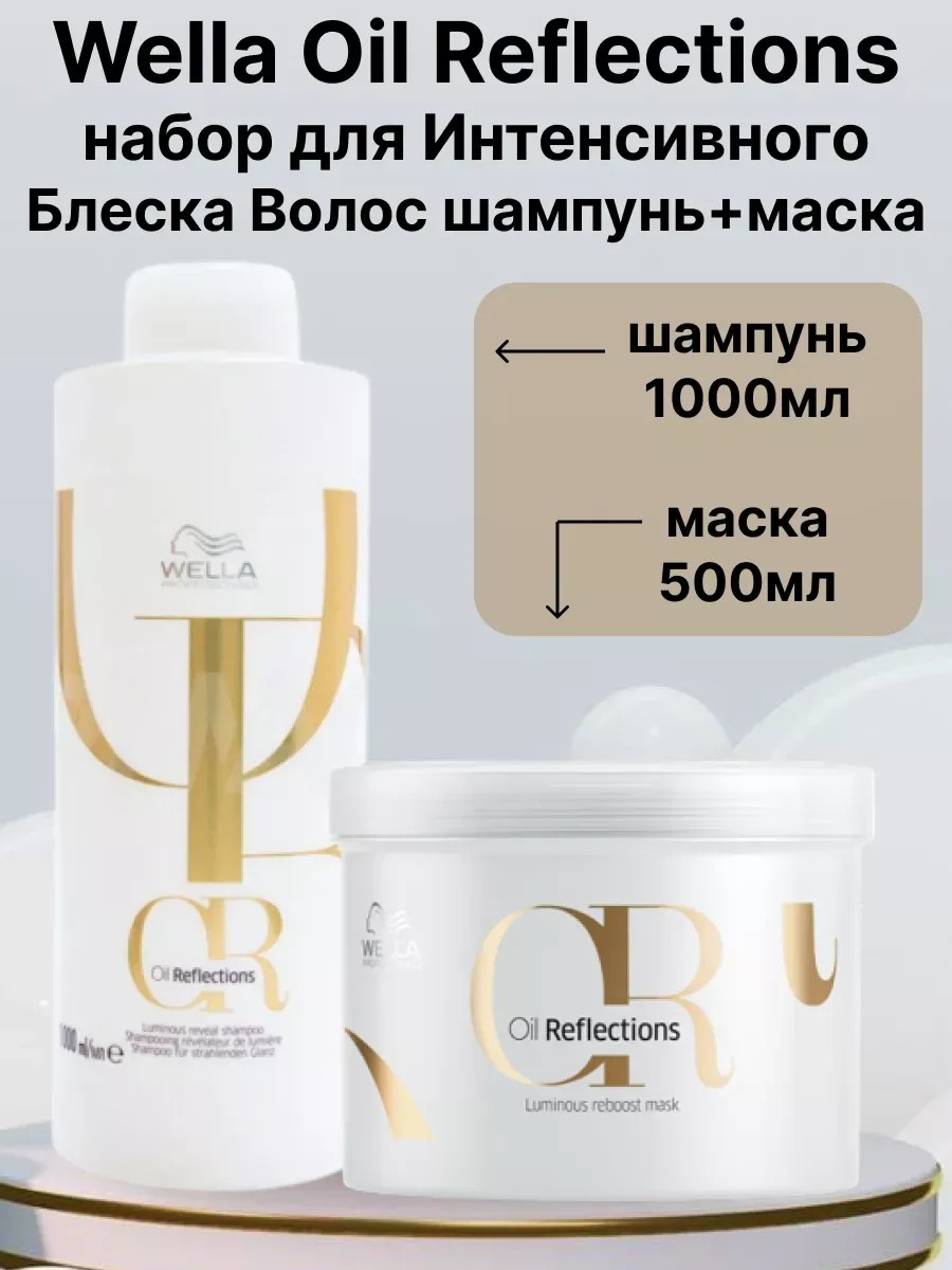 Wella Oil Reflections Интенсивный шампунь1000+маска500мл Шампунь для Глубокое очищение и придание волосам гладкости и интенсивного блеска с шампунем Wella Professionals Oil Reflections. Этот профессиональный продукт для ухода интенсивно очищает и увлажняет волосы. Легкая формула этого шампуня Oil Reflections придает волосам изумительный блеск. Способ применения: