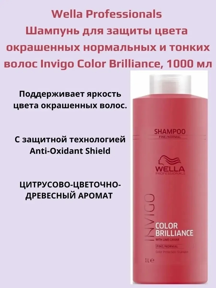 Шампунь для защиты цвета Wella Invigo Color Brilliance. Поддерживает яркость цвета окрашенных волос. С защитной технологией Anti-Oxidant Shield. С формулой Color Brilliance-Бленд: Инкапсулирующие медь молекулы поддерживают яркость. Гистидин и витамин Е помогают контролировать процесс окисления после окрашивания и защищают цвет. Лаймовая икра содержит витамины и антиоксиданты. Шампунь для волос Wella professional (велла профессионал) подходит для ухода волос.Шампунь для волос профессиональный для объема, для всех типов волос.Подойдет и для мужчин.Низкий уровень рH закрывает кутикулу волоса сразу после окрашивания, за счет чего красящий пигмент дольше сохраняется внутри волоса.ЦИТРУСОВО-ЦВЕТОЧНО-ДРЕВЕСНЫЙ АРОМАТ игра контрастов освежающего цитрусового коктейля, дополненного теплыми древесными нотами. Способ применения: Нанести шампунь Велла на влажные волосы. Вспенить и тщательно смыть. При необходимости повторить.