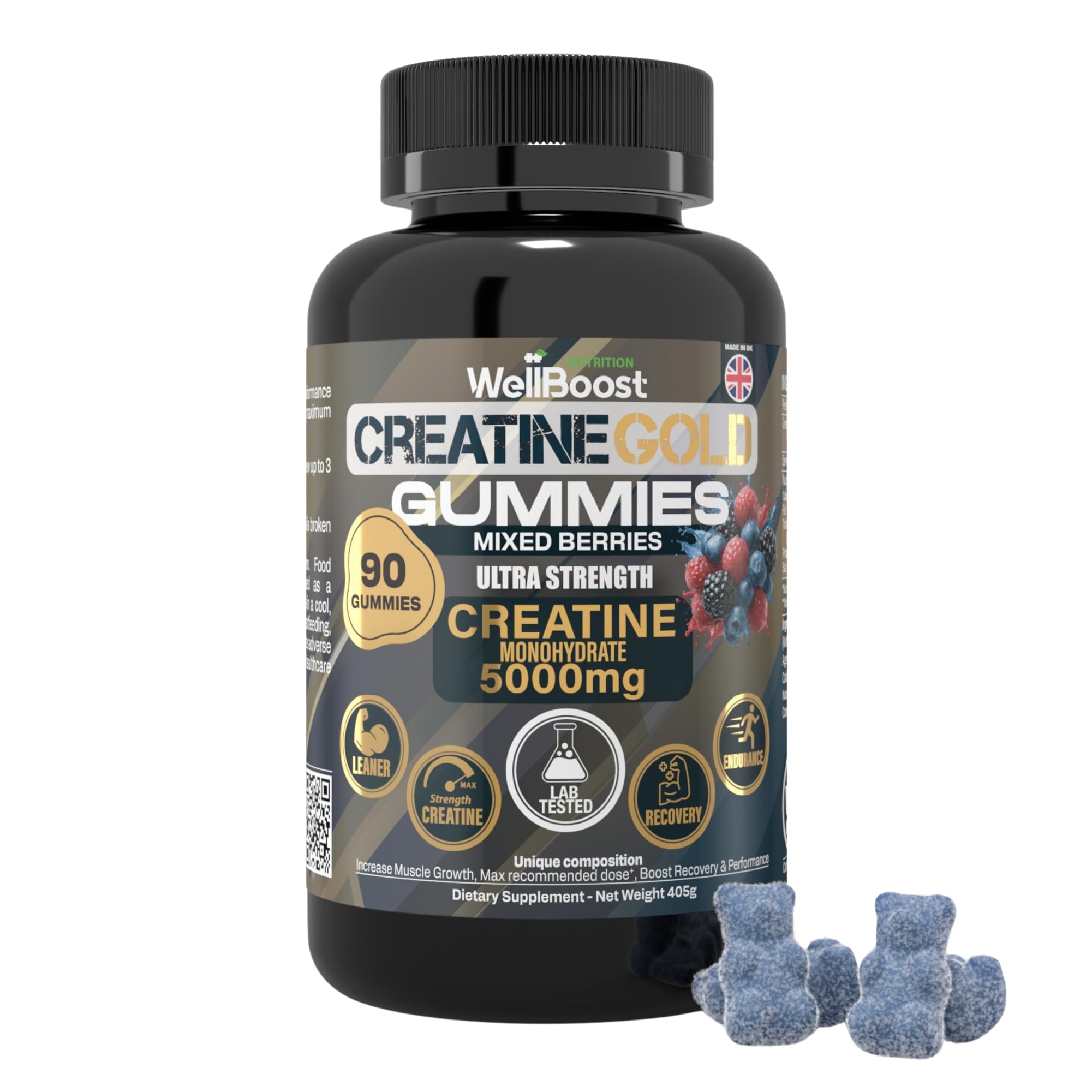 WellBoost Creatine Gold 5000mg Creatine Monohydrate Vegan Sugar-Free Gummies for Lean Muscle Growth Endurance Recovery & Energy (1 Month Supply) with Mixed Berry Flavour.