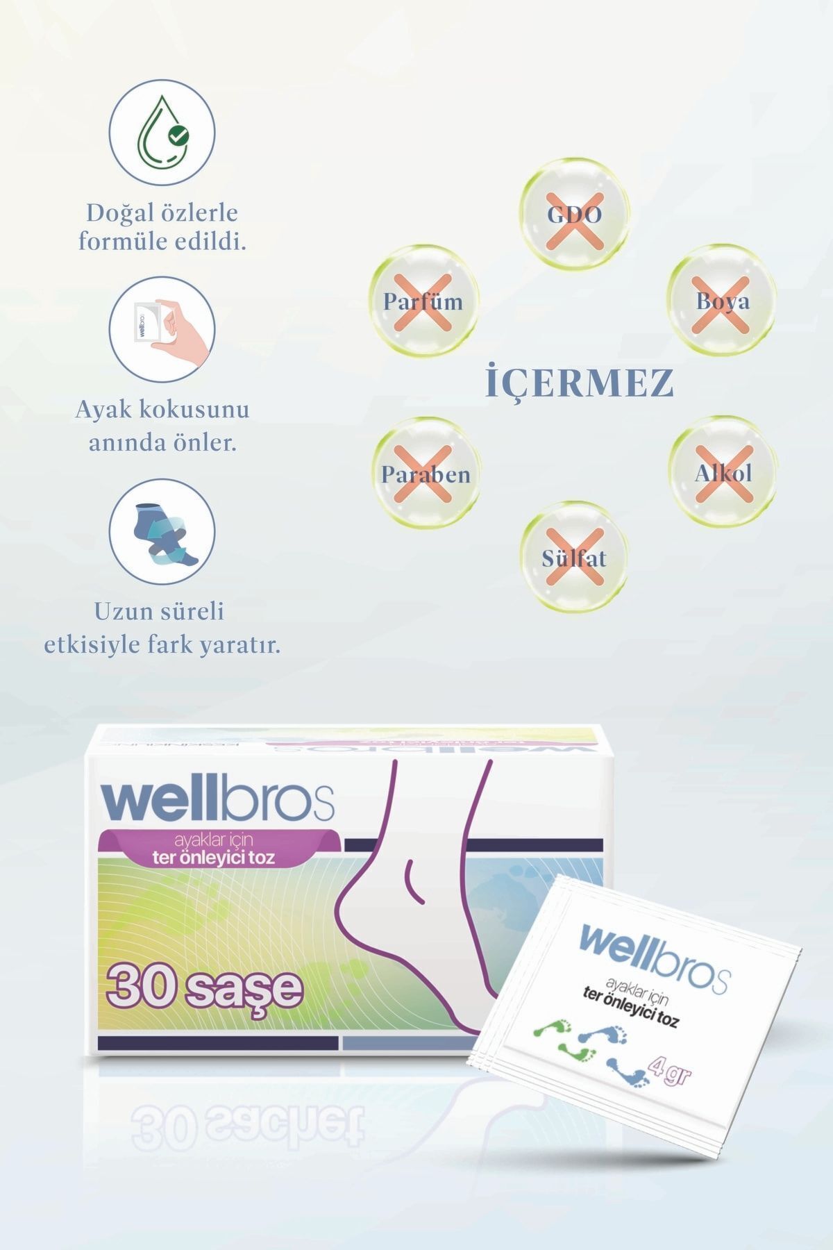 .Wellbros Ayaklar için ter önleyici toz'un bitkisel özlerden olusan ekstra güçlü formülü kokuyu aninda kaynaginda hedefler.