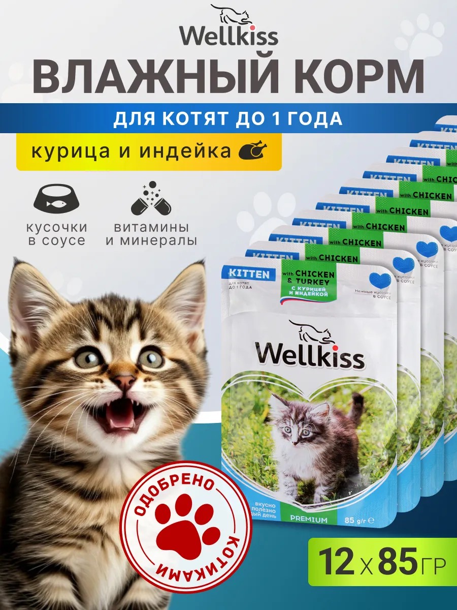 Wellkiss Влажный корм для котят, с курицей и индейкой в соусе, 85 гр. * 12 шт.