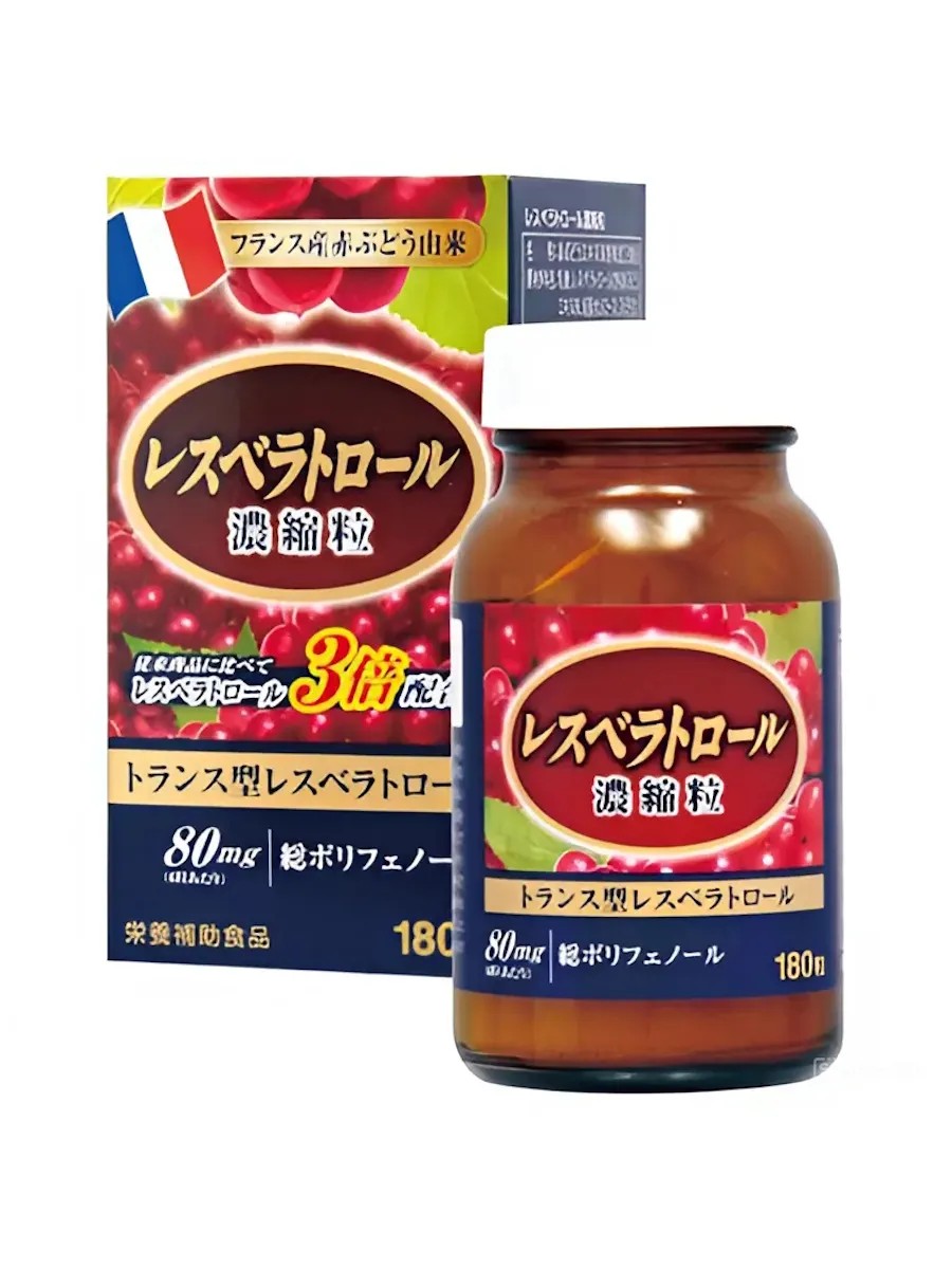 | Composition | trans-resveratrol 10 mg (total polyphenols 80 mg); dextrin; red grape extract (containing resveratrol); lingonberry extract; raspberry extract; crystalline cellulose; glycerol ether; vitamin C; niacin; vitamin E, calcium pantothenate, vitamin B6, vitamin B2, vitamin B1, vitamin A; folic acid, vitamin D, vitamin B12; Finely dispersed silicon dioxide |