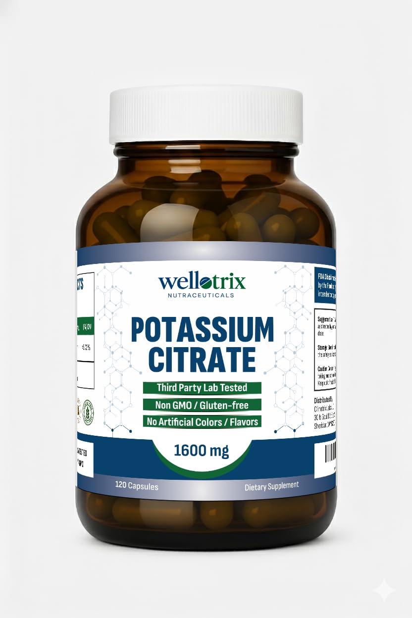 Wellotrix Nutraceuticals brings you a high-potency Potassium Citrate supplement designed to support daily wellness and mineral balance. With 1600 mg per serving, our plant-based capsules are ideal for individuals seeking quality electrolyte support in a clean-label formula. Crafted in the USA, our capsules are vegan, non-GMO, and free from gluten, soy, and artificial additives. Each batch is lab-tested for purity, ensuring you get only the best — no fillers, no compromises. Why Choose Wellotrix Potassium Citrate? ✓ 1600 mg Potassium Citrate per serving ✓ Vegan, Non-GMO, Gluten-Free ✓ Made in cGMP-certified USA facility ✓ Third-party tested for purity ✓ Easy-to-swallow vegan capsules Your health deserves premium ingredients — choose Wellotrix, where science meets purity.✓ Wellotrix Quality – Trusted Nutraceuticals Formulated by Wellotrix Nutraceuticals, backed by science, and designed for those who demand clean, reliable supplements for everyday wellness. ✓ 120 Capsule Supply – Convenient Cost-Effective Get a full 2-month supply with just 2 capsules daily. Perfect for daily health routines — supports hydration, mineral balance, and more. . ✓ Clean Label Promise – No Junk, Just Quality Non-GMO, gluten-free, and free from artificial preservatives. Manufactured in a cGMP-certified USA facility and third-party tested for purity and safety. ✓ Pure Plant-Based – 100 Vegan Capsules Crafted with clean, plant-based ingredients — free from gelatin, dairy, soy, and artificial additives. Easy to digest, gentle on the stomach. ✓ Dual Strength Formula – 1600 mg Per Serving High potency Potassium Citrate delivers 1600 mg per 2-capsule serving — ideal for maintaining mineral balance and supporting overall wellness.