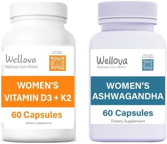 WOMEN'S VITAMIN D3 K2 Promotes Energy Mood Support Supports Bone Heart Health Provides Immune Support Superior Pure Organic Absorption 60 Capsules. WOMEN'S ORGANIC ASHWAGANDHA CAPUSLES - With 650mg of potent ashwagandha per count, it's packed with withanolides to enhance focus, boost energy, and strengthen your immune system, all while being vegan, vegetarian, and non-GMO. Wellova Women's Ashwagandha 60 Capsules Women's D3 K2 60 Capsules - Bundle.