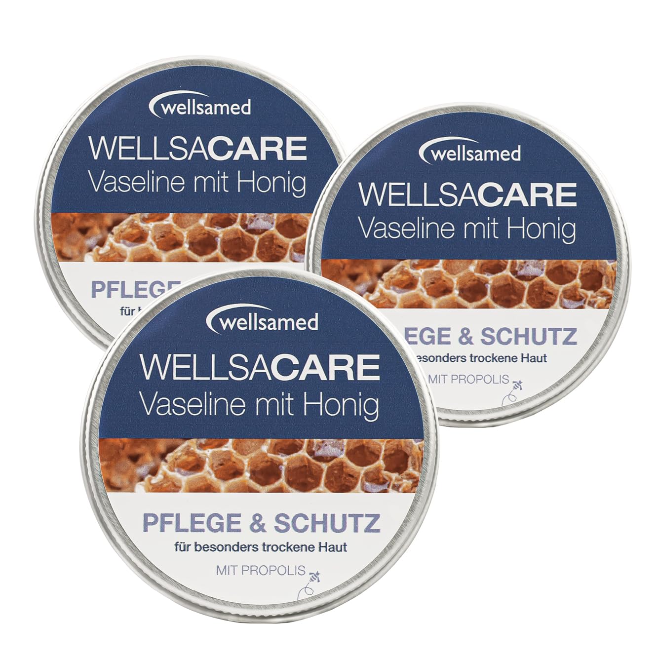 The rich Wellsacare Vaseline Cream with Honey from Wellsamed provides intense moisture and deeply cares for particularly dry, damaged skin and lips. Ideal for daily use, but also as protection against the cold in the winter months. The valuable ingredients such as honey, vitamin E and propolis protect your skin against dryness and harmful external influences. St. John's wort and marigold soothe irritated skin, relieve itching and inflammation and promote wound healing. The Vaseline is suitable for all skin types, including sensitive skin. Contents: 3x 50 ml jar of Wellsacare Vaseline cream with honey, ringed flower and St. John's wort. Made in the EU. Ingredients: Petrolatum, Helianthus Annuus seed oil, Calendula Officinalis flower extract, Hypericum Perforatum flower extract, Propolis wax, Tocopherol, Tocopheryl acetate, Mel, Honey, CI 47000, CI 26100. SAFETY WARNING Store dry and cool. Avoid direct sunlight. Keep out of the reach of children.INGREDIENTS Petrolatum, Helianthus Annuus (Sunflower) seed oil, Calendula Officinalis flower extract, Hypericum Perforatum flower extract, Propolis wax, Tocopherol, Tocopheryl acetate, Mel, Honey, CI 47000, CI 26100. SCOPE OF SUPPLY 3x 50 ml can of wellsacare Vaseline cream with honey, marigold and St. John's wort. Made in the EU. ANTI-INFLAMMATORY ACTION Johannes wort and daisies soothe irritated skin, relieve itching and inflammation and promote wound healing. Suitable for all skin types. NATURAL PROTECTIVE PEEL Valuable extracts from honey, vitamin E and propolis protect your skin against dryness and harmful external influences. INTENSIVE CARE The rich Vaseline cream intensively hydrates and especially cares for dry, damaged skin and lips. Ideal for daily use and as protection against the cold.Wellsamed Wellsacare Vaseline Crème, 150 ml (3 x 50 ml) met honing, goudsbloem en sint-janskruid voor de droge huid en lippen, verzorgt en beschermt, vochtinbrengende crème met vitamine E en propolis honing 50 ml (3er Pack) De rijke Wellsacare Vaseline Crème met Honing van Wellsamed geeft intens vocht en verzorgt bijzonder droge, beschadigde huid en lippen diepgaand. Ideaal voor dagelijks gebruik, maar ook als bescherming tegen kou in de wintermaanden. De waardevolle ingrediënten zoals honing, vitamine E en propolis beschermen je huid tegen droogheid en schadelijke invloeden van buitenaf. Johanniskruid en goudsbloem kalmeren geïrriteerde huid, verlichten jeuk en ontstekingen en bevorderen de genezing van wonden. De vaseline is geschikt voor alle huidtypes, ook voor de gevoelige huid. Inhoud: 3x 50 ml pot Wellsacare vaseline crème met honing, ringelbloem en sint-janskruid. Gemaakt in de EU. Ingrediënten: Petrolatum, Helianthus Annuus zaadolie, Calendula Officinalis bloemextract, Hypericum Perforatum bloemextract, Propolis was, Tocoferol, Tocoferylacetaat, Mel, Honing, CI 47000, CI 26100. VEILIGHEIDSWAARSCHUWING Droog en koel bewaren. Vermijd direct zonlicht. Buiten het bereik van kinderen bewaren.INGREDIËNTEN Petrolatum, Helianthus Annuus (Zonnebloem) zaadolie, Calendula Officinalis bloemextract, Hypericum Perforatum bloemextract, Propolis was, Tocoferol, Tocoferyl acetaat, Mel, Honing, CI 47000, CI 26100. LEVERINGSOMVANG 3x 50 ml blik wellsacare vaseline crème met honing, goudsbloem en sint-janskruid. Gemaakt in de EU. ONTSTEKINGSREMMENDE WERKING Johanniskruid en madeliefjes kalmeren geïrriteerde huid, verlichten jeuk en ontstekingen en bevorderen de genezing van wonden. Geschikt voor alle huidtypes. NATUURLIJKE BESCHERMINGSSCHIL Waardevolle extracten uit honing, vitamine E en propolis beschermen je huid tegen droogheid en schadelijke invloeden van buitenaf. INTENSIEVE VERZORGING De rijke vaselinecrème hydrateert intensief en verzorgt vooral de droge, beschadigde huid en lippen. Ideaal voor dagelijks gebruik en als bescherming tegen de kou.