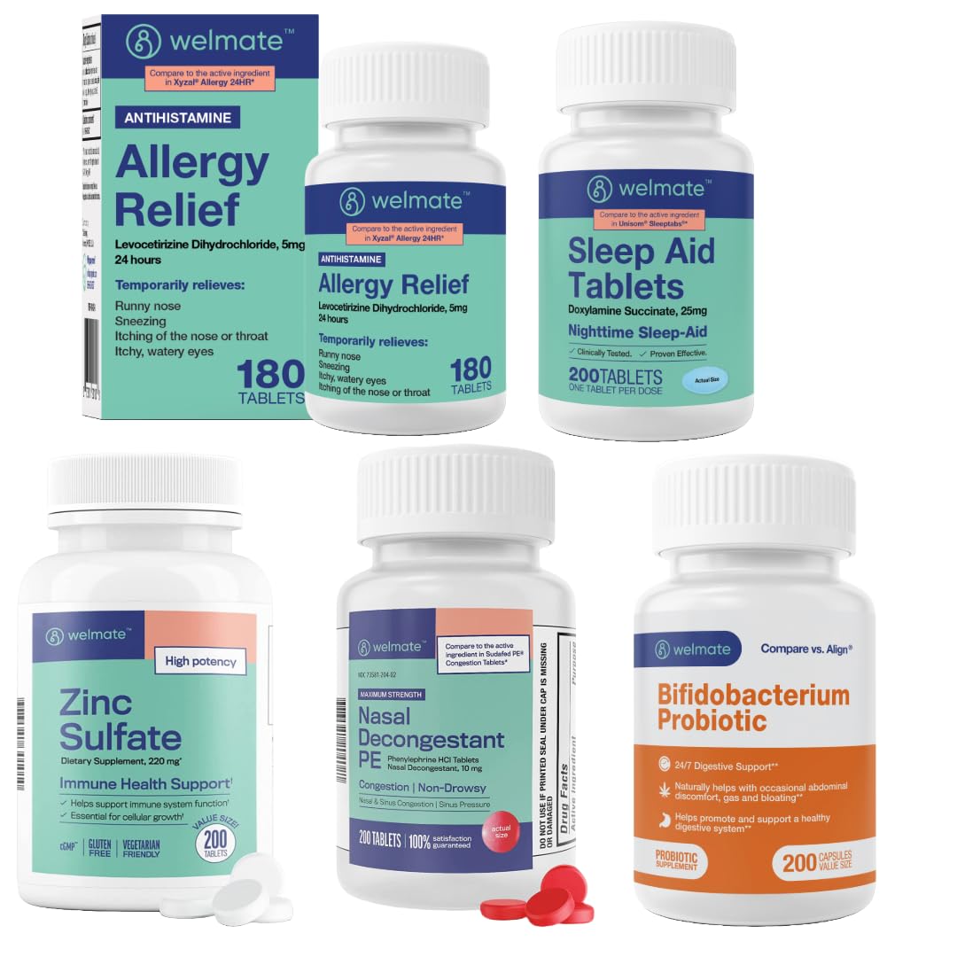 WELMATE Complete Allergy & Wellness Kit: Generic Xyzal Levocetirizine 5mg (24hr Support) Phenylephrine HCl Nasal Decongestant Doxylamine Sleep Aid Bifidobacterium Probiotic & Zinc Sulfate