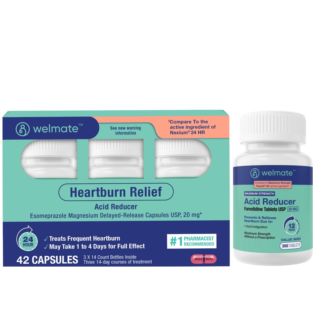 WELMATE Heartburn Relief Bundle 24HR + Fast Acting Acid Reducers Esomeprazole 42ct + Famotidine 300ct