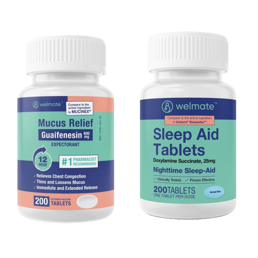 WELMATE Nighttime Wellness Bundle: Mucus Relief Guaifenesin 600mg Mucus Relief (200 Ct) & Doxylamine Succinate 25mg Sleep Aid (200 Ct) | Extended Relief for Restful Sleep