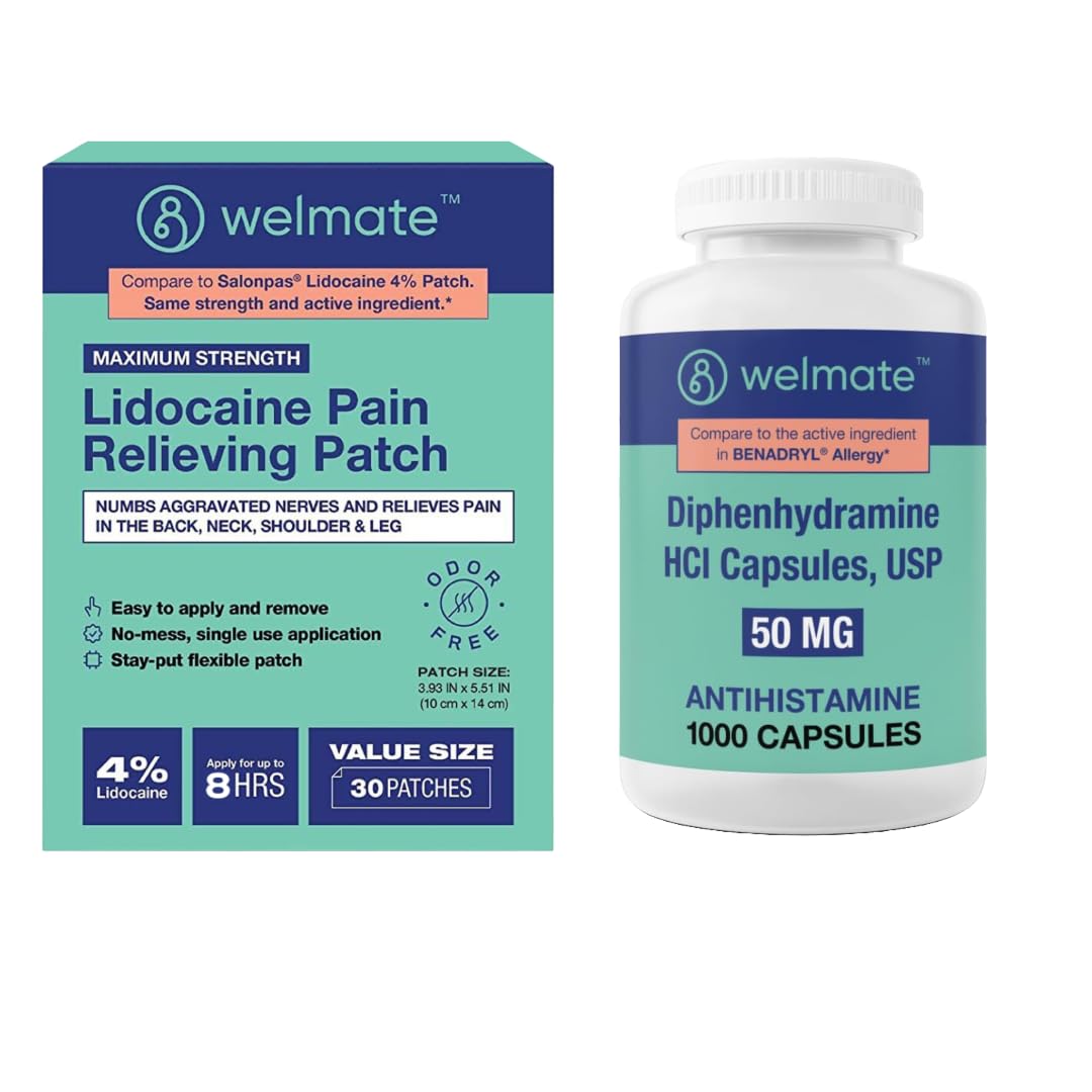 WELMATE Pain Relief & Sleep Support Kit: 4% Lidocaine Numbing Patch (30 Ct) & Nighttime Sleep-Aid Diphenhydramine 50mg (1000 Ct)