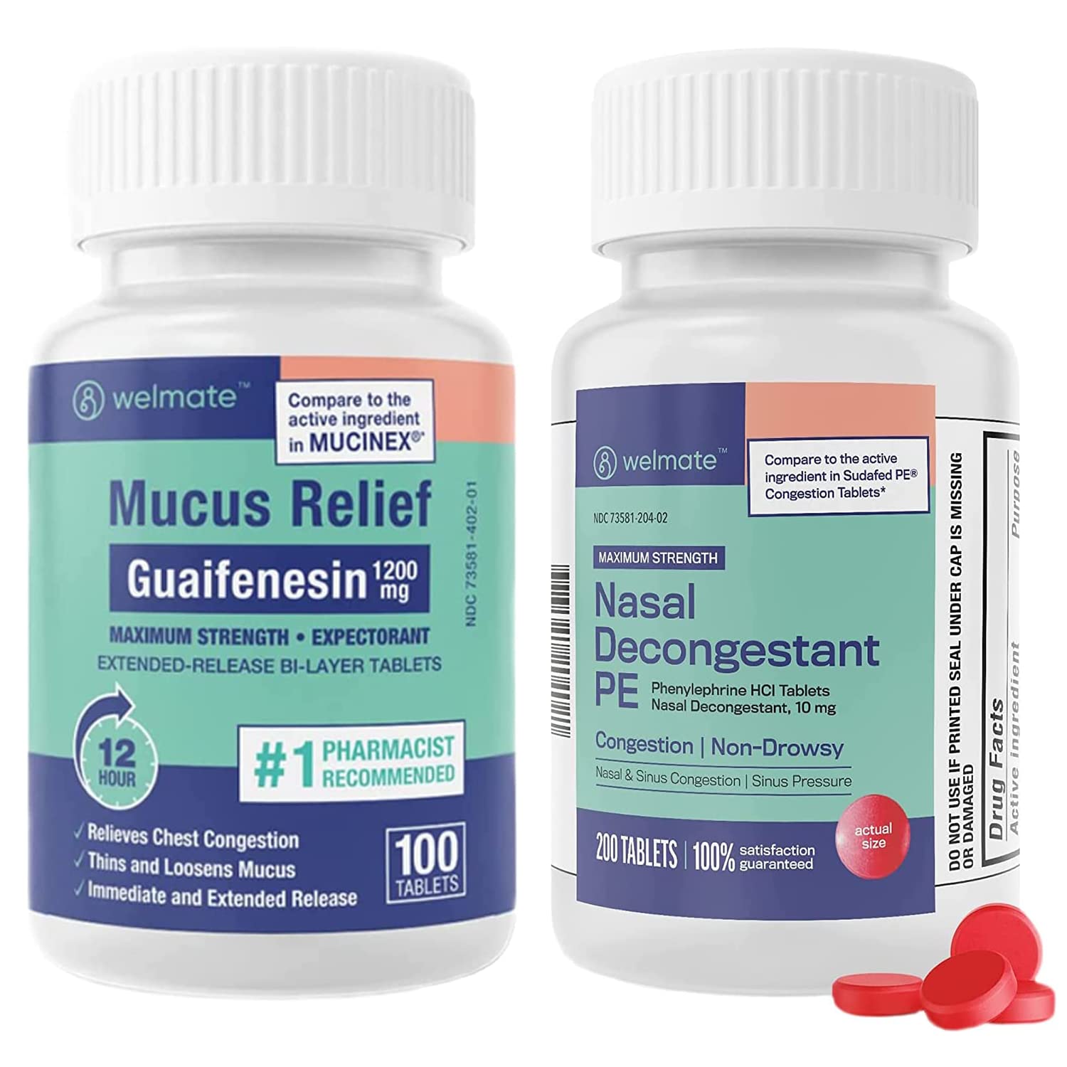 Alleviate respiratory discomfort with the WELMATE Respiratory Relief Bundle, your comprehensive solution for chest and nasal congestion. Our Maximum Strength Guaifenesin 1200mg is an effective expectorant, designed to thin and loosen mucus, reducing chest congestion from colds, infections, or irritants. Each bi-layer tablet offers up to 12 hours of relief, with the first layer providing immediate action and the second continuing to work throughout the day. This ensures your coughs are more productive, clearing bronchial passageways of bothersome mucus. Safe for adults and children over 12, take 1 tablet every 12 hours to maintain clear lungs and comfortable breathing. Complementing this is our Maximum Strength Phenylephrine HCl 10 mg Nasal Decongestant PE, providing powerful relief from nasal congestion associated with the common cold, allergies, or other sinus irritants. This non-drowsy formula targets sinus pressure and stuffiness, allowing for easier breathing and relief from cold symptoms. Together, these two products form the ultimate respiratory care duo, ensuring both your chest and nasal passages are free from congestion and discomfort. With this bundle, you can confidently manage cold and allergy symptoms, ensuring you feel your best even during peak cold and allergy seasons.Proudly Made & Trusted Ingredients: Both products are proudly made with high-quality ingredients. Guaifenesin compares to the active ingredient in Muci-nex, and Phenylephrine HCl is comparable to Suda-fed PE Congestion, ensuring reliable and effective relief. Safe and Convenient: Suitable for adults and children over 12 years old. Guaifenesin should be taken every 12 hours (not exceeding 2 tablets in 24 hours), while Phenylephrine can be taken every 4 hours (up to 6 tablets in 24 hours), ensuring round-the-clock relief. Effective Nasal Congestion Management: Phenylephrine HCl 10mg delivers non-drowsy, all-day relief from nasal congestion, reducing swelling in the nose and ears to relieve sinus pressure, blockages, and congestion. Extended-Release Mucus Control: Guaifenesin 1200mg features a unique bi-layer tablet design offering immediate and up to 12-hour extended relief, thinning and loosening mucus to make coughs more productive and clear airways. Dual-Action Congestion Relief: Combines Guaifenesin 1200mg, an effective expectorant for chest congestion, with Phenylephrine HCl 10mg for maximum strength nasal decongestion. Together, they provide comprehensive relief from symptoms associated with colds, allergies, and respiratory irritants.