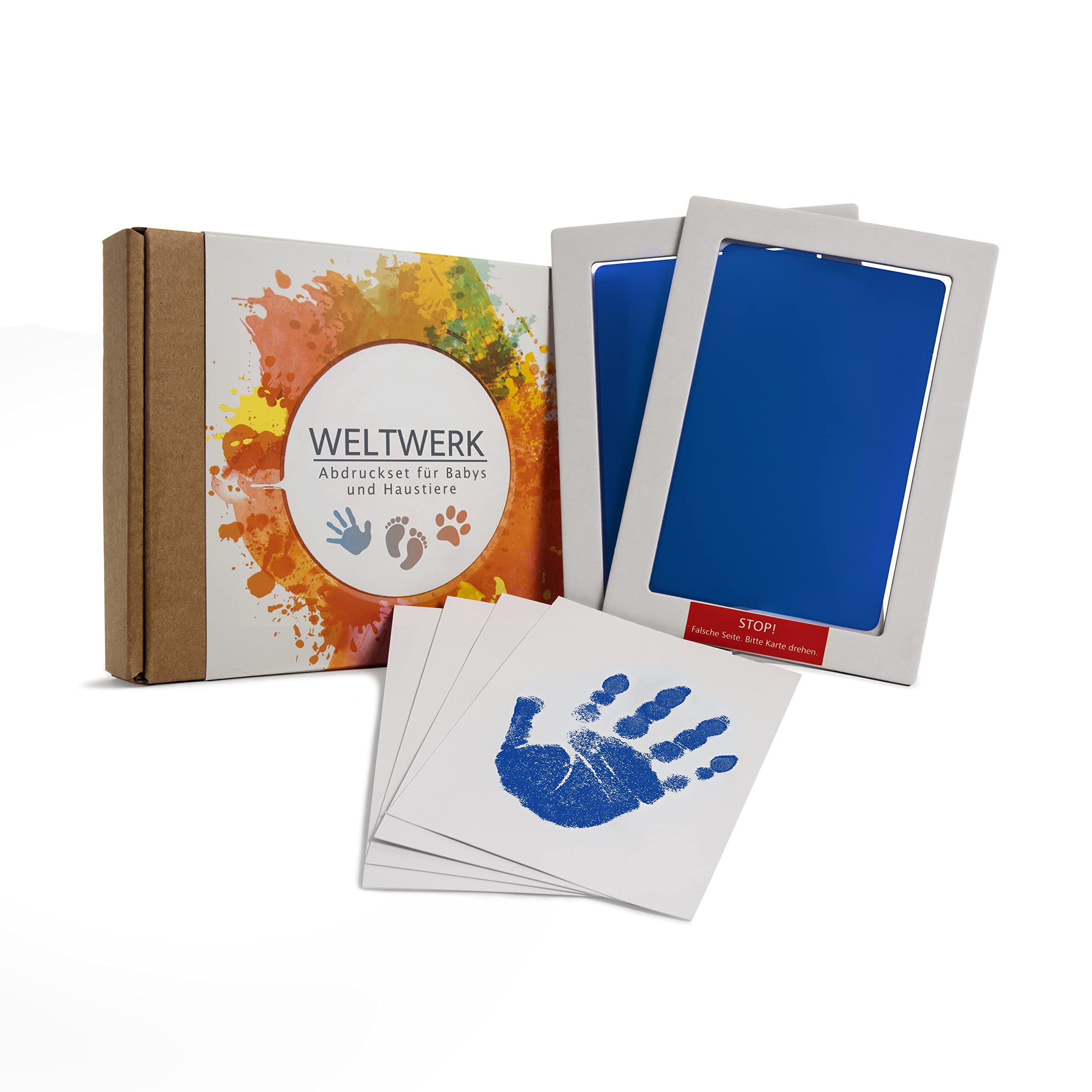 German company: As a German company, we have made it our task to always be available to our customers.If the impression did not work as you imagined it, send us an email with your problem.We are guaranteed to find a solution!.Perfect gift idea: Thanks to the nice packaging and good workmanship, the print set is perfect as a small surprise or gift for every occasion.The cardboard continues to be reused.Memory for eternity: effortlessly create a timeless memory in a few minutes.The prints by hand, foot and paw can be used in a variety of ways in combination with picture frames or postcards.Be creative!.Everything remains clean: thanks to the patented Clean Touch technology, skin or paw never come into contact with the ink.The use of the baby impression set is therefore completely harmless and safe.Simple application: With the World Work Baby Handprint and Footprint Set, it is child's play to create the perfect impression of your baby or pet!The complete set enables you between two and four clean prints.