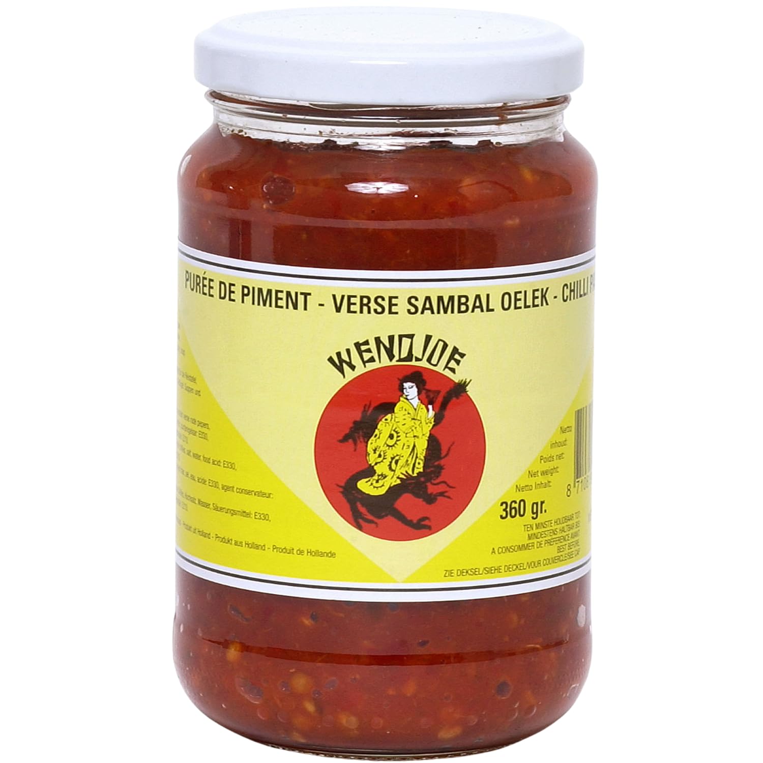 Wendjoe Sambal Oelek Chili Paste is a very spicy, thick paste based on peppers, lime juice and salt. It is most popular in Indonesia, where it is added to almost every dish. It works great as a seasoning for hot dishes, different types of meat, seafood, pasta and soups. It also goes with all sauces and adds spiciness without compromising other flavors. Irreplaceable for lovers of hot spices. comes in 360 gr. INGREDIENTS Fresh chilies, cooking salt, acid: E260, preservative: E211. INSTRUCTIONS FOR USE Add the sambal while cooking hot dishes, different types of meat, seafood, pasta and soups. See moreWendjoe Sambal Oelek Chili pasta 360 g Wendjoe Sambal Oelek Chili Pasta is een zeer pittige, dikke pasta op basis van pepers, limoensap en zout. Het is het populairst in Indonesië, waar het aan bijna elk gerecht wordt toegevoegd. Het werkt uitstekend als smaakmaker voor warme gerechten, verschillende soorten vlees, zeevruchten, pasta's en soepen. Het past ook bij alle sauzen en voegt kruidigheid toe zonder andere smaken aan te tasten. Onvervangbaar voor liefhebbers van hete specerijen. komt in 360 gr. INGREDIËNTEN Verse chilies, kookzout, voedselzuur: E260, conserveringsmiddel: E211. GEBRUIKSAANWIJZING Voeg het sambal toe tijdens het koken van warme gerechten, verschillende soorten vlees, zeevruchten, pasta en soepen. Meer bekijken