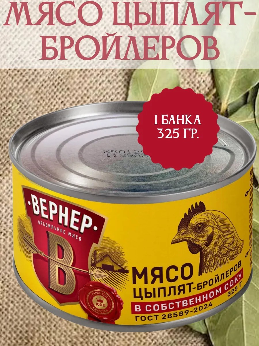 ВЕРНЕР Мясо цыплят-бройлеров в собственном соку, 1 банка 325 гр.