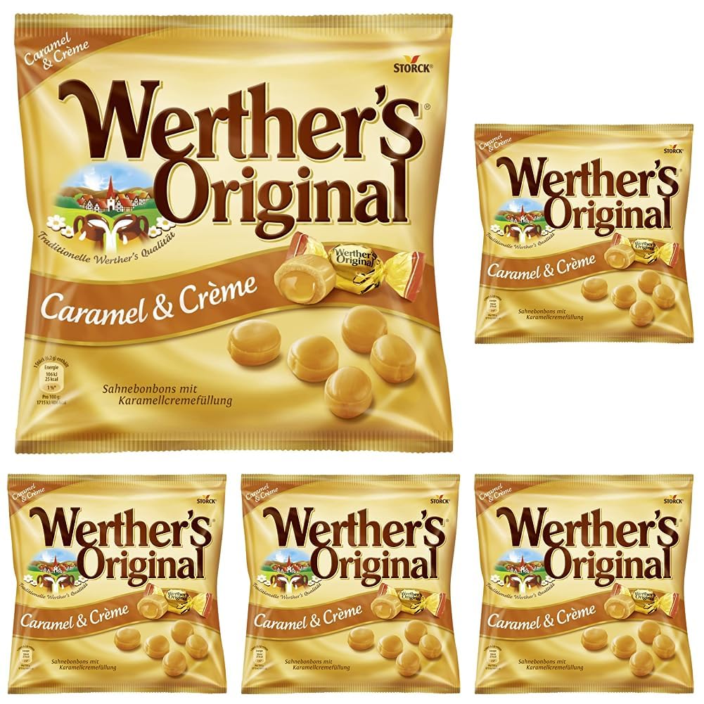 Ingredients ingredients Ingredients: sugar, glucose syrup, glucose fructose syrup, cream (7 ), condensed sweet whey, butter (4.5 ), condensed lean milk, pipe sugar syrup, salt, butter grease, whey product, emulgator lecithine (soy), aromas.delivery: 1 x 225g Werther's original caramel and crème cream bonbons with caramel cream filling individually packed ideal for on the go.Werther's original cream bonbons with caramel cream filling are ideal for on the go, for enjoying and snacking.Whether for on the go or at home with family and friends: the delicious, sweet candies offer a caramel taste experience at any time for a feeling of home and security.The ideal connection made of a hard caramel cover and a soft core of caramel cream: a delicate fluid caramel filling gives the creamy sweet sweets a delicious taste.Incomparable taste: The fine cream caramels with wonderfully creamy filling ensure special moments of pleasure.The following information applies to each unit per pack.INHALTSSTOFFE ZUTATEN Zutaten: Zucker, Glukosesirup, Glukose-Fruktose-Sirup, SAHNE (7 ), kondensierte SÜßMOLKE, BUTTER (4,5 ), kondensierte MAGERMILCH, Rohrzuckersirup, Salz, BUTTERREINFETT, MOLKENERZEUGNIS, Emulgator Lecithine (SOJA), Aromen.Lieferumfang: 1 x 225g Werther's Original Caramel und Crème Sahnebonbons mit Karamellcremefüllung Einzeln verpackt Ideal für unterwegs. Werther's Original Sahnebonbons mit Karamellcremefüllung eignen sich hervorragend für unterwegs, zum Genießen und Naschen. Ob für unterwegs oder daheim mit der Familie und Freunden: Die leckeren, süßen Bonbons bieten jederzeit ein karamelliges Geschmackserlebnis für ein Gefühl von Zuhause und Geborgenheit. Die ideale Verbindung aus einer harten Karamellhülle und einem weichen Kern aus Karamellcreme: Eine zartfließende Karamellfüllung verleiht den sahnig süßen Bonbons einen köstlichen Geschmack. Unvergleichlicher Geschmack: Die feinen Sahne-Karamellen mit herrlich cremiger Füllung sorgen für besondere Genussmomente. Die folgenden Informationen gelten für jede Einheit pro Packung.Werther's Original Caramel und Crème – 1 x 225g – Klassische Sahnebonbons mit Karamellgeschmack und Karamellcremefüllung (Packung mit 5) 1 x 225g (Packung mit 5) Caramel Crème