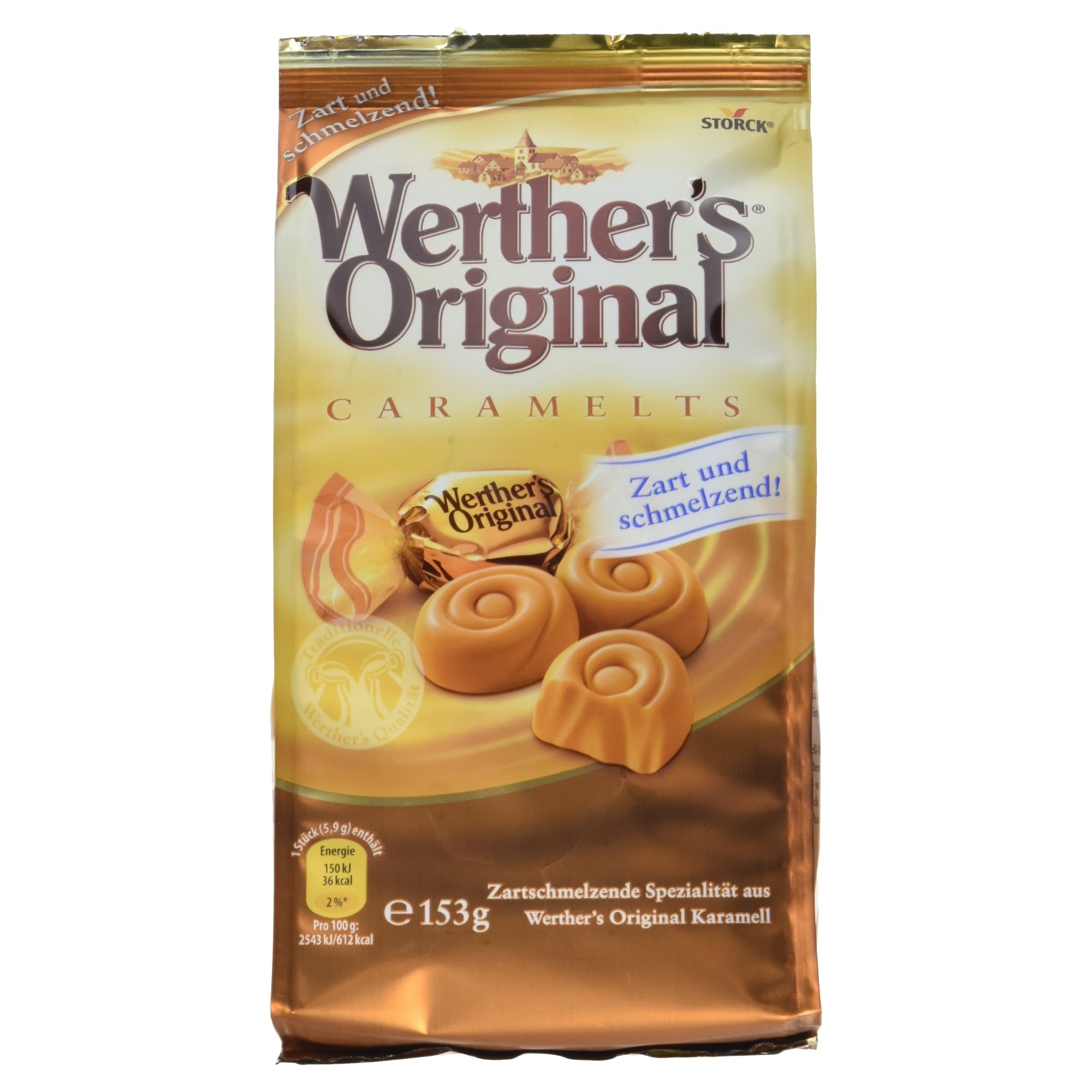 Werther's original caramelts The tender Werthers original caramelts are delicious caramel candies that have a particularly gentle, creamy-sweet pleasure.Refined with the best, chosen ingredients, the sweets convince in particular with an intensive caramel taste that melted on the tongue.The individual packaging can be divided with friends or family, or can also be nibbled perfectly on the go- the caraments fit for every occasion and give special moments.Whether as a creamy candy, creamy toffee, soft caramel toffees, delicate melting confectionery or even sugar-free- the Werther's original just all over the witness ... because we are all something special!Ingredients contains the caramel confection: sugar, herbal fats (palm, shea), cream powder (14.4 %), whey product, butter grease, maltodextrin, lean milk powder, lean cocoa, emulgator lecithine (soy), caramel sugar syrup, natural aromas, salt and canContain shares of hazelnut, almond, peanut and other nuts.Werther's Original 1909 in the town of Werther: Sugar baker Gustav Nebel wanted to wear his best skill and created his best candy this year.He invested a lot of love, care and time and united the best ingredients to create his masterpiece.This resulted in the caramel candies that are still unmistakable under the name of Werther's original, which are available in many variations these days. Ingredients / ingredients Ingredients: sugar, herbal fats (palm, shea), cream powder (14.4%), whey product, butter grease, maltodextrin, lean milk powder, lean cocoa, emulsifier lecithine (soy), caramel sugar syrup, natural aromas, salt., Contain almond, peanut and other nuts. Address manufacturer/importer Waldstr.27, D-13403 Berlin More scope of delivery: 1 x 153g bag Werther's original caramelts / small chewing monbon sweetness with an intensive caramel taste in a practical individual packaging.Werther's real lollipops consist of fresh cream, golden yellow Kandis, good butter refined with the best ingredients and convince with a caramel taste that melted on the tongue.The mini sweets are individually packed, so they are ideal for snacking, sharing with friends & family or for birthdays - a caramel candy is never wrong!.The caramel candies are refined with chosen ingredients, made with a lot of love and taste so familiar with caramely - delicious candies that fit every opportunity.Werther Caramelts are delicious caramel specialties and spoil every caramel lover with a gentle, creamy-sweet palate-an irresistible pleasure for everyone!. Werther's Original Caramelts Die zarten Werthers Original Caramelts sind köstliche Karamell-Bonbons, die einen besonders sanften, sahnig-süßen Genuss haben. Mit besten, auserwählten Zutaten verfeinert, überzeugen die Bonbons insbesondere mit einem intensiven Karamell-Geschmack, der auf der Zunge zergeht. Durch die Einzelverpackung können die Bon- bons ideal mit Freunden oder Familie geteilt werden oder können auch perfekt unterwegs vernascht werden – die Caramelts passen zu jeder Gelegenheit und schenken besondere Momente. Ob als sahniges Bonbon, cremiges Toffee, weiche Karamell Toffees, zart schmelzendes Konfekt oder auch zuckerfrei – die Werther's Original über- zeugen einfach immer... weil wir alle etwas Besonderes sind! Zutaten Das Karamell-Konfekt enthält: Zucker, pflanzliche Fette (Palm, Shea), Sahnepulver (14,4 %), Molkenerzeugnis, Butterreinfett, Maltodextrin, Magermilchpulver, magerer Kakao, Emulgator Lecithine (Soja), Karamellzuckersirup, natürliche Aromen, Salz und kann Anteile von Haselnuss, Mandel, Erdnuss und anderen Nüssen enthalten. Werther's Original 1909 im Städtchen Werther: Zuckerbäcker Gustav Nebel wollte sein bestes Können zu Tage tragen und erschuf in diesem Jahre sein bestes Bonbon. Er investierte viel Liebe, Sorgfalt und Zeit und vereinte die besten Zutaten, um sein Meisterwerk zu erschaffen. Daraus entstanden die bis heute unverkennbaren Karamellbonbons unter dem Namen Werthers Original, die es heutzutage in vielen Variationen gibt. INHALTSSTOFFE / ZUTATEN Zutaten: Zucker, pflanzliche Fette (Palm, Shea), SAHNEPULVER (14,4%), MOLKENERZEUGNIS, BUTTERREINFETT, Maltodextrin, MAGERMILCHPULVER, magerer Kakao, Emulgator Lecithine (SOJA), Karamellzuckersirup, natürliche Aromen, Salz.#KANN AUCH ANTEILE VON HASELNUSS, MANDEL, ERDNUSS UND ANDEREN NÜSSEN ENTHALTEN. ANSCHRIFT HERSTELLER/IMPORTEUR Waldstr. 27, D-13403 Berlin MehrLieferumfang: 1 x 153g Beutel Werther's Original Caramelts / Kleine Kaubonbon-Süßigkeiten mit einem intensiven Karamell-Geschmack in einer praktischen Einzelverpackung. Werthers Echte Lutschbonbons bestehen aus frischer Sahne, goldgelben Kandis, guter Butter verfeinert mit besten Zutaten und überzeugen mit einem karamelligen Geschmack, der auf der Zunge zergeht. Die Mini Süßigkeiten sind einzeln verpackt, sodass sie sich ideal zum Naschen, zum Teilen mit Freunden & Familie oder auch für Geburtstage eignen – ein Karamell Bonbon ist nie verkehrt!. Die Karamellbonbons sind mit auserwählten Zutaten verfeinert, mit viel Liebe hergestellt und schmecken so besonders vertraut karamellig – köstliche Bonbons, die zu jeder Gelegenheit passen. Werthers Caramelts sind leckere Karamell-Spezialitäten und verwöhnen jeden Caramel-Liebhaber mit einer sanften, sahnig-süßen Gaumenfreude – ein unwiderstehlicher Genuss für jedermann!.Werther's Original Caramelts (1 x 153g) / Zartschmelzendes Karamell Konfekt