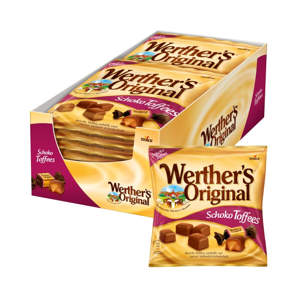 Werther's original chocolate toffees Werther's original chocolate toffees bribe through their incomparable chocolate caramel Taste.The delicious combination of soft caramel core and delicately melting Fully milk chocolate creates very special moments of pleasure.The creations of Werther's Original have been for enjoyment and the sweet taste of childhood for generations.Werther's Original chocolate toffees seduce with their wonderfully soft caramel core enveloped by a layer of delicately melting whole milk chocolate.A little bit of bliss. Ingredients ingredients Ingredients: glucose syrup, sugar, condensed sweet toxic milk, whole milk powder, cocoa butter, butter grease, palm fat, cocoa mass, wetlands sorbitis syrup, butter milk powder, milk sugar, aromas, salt, emulsifier . Can also shares of hazelnut,Almond, peanut and other nuts contain. Address manufacturer importer Waldstr.27, D-13403 Berlin Moredelivery: 15 x 180g Werther's original chocolate toffees individually packaged ideal for on the go.Werther's original chocolate toffees are ideal for on the go, to enjoy and snack.Whether for on the go or at home with family and friends: the delicious, sweet candies offer a caramely-chocolate taste experience for a feeling of home and security at all times.The delicious combination of a wonderfully soft caramel core enveloped by a layer of delicately melting whole milk chocolate gives the soft candies its irresistible taste.Incomparable taste: The delicious caramel fabric with a fine whole milk chocolate cover (30 percent) ensure special moments of pleasure.Werther's Original Schoko Toffees Werther's Original Schoko Toffees bestechen durch ihren unvergleichlichen Schoko-Karamell Geschmack. Die köstliche Kombination aus weichem Karamell-Kern und zartschmelzender Vollmilch-Schokolade schafft ganz besondere Genussmomente. Die Kreationen von Werther's Original stehen seit Generationen für Genuss und den süßen Geschmack der Kindheit. Werther's Original Schoko Toffees verführen mit ihrem wunderbar weichen Karamell-Kern umhüllt von einer Schicht zartschmelzender Vollmilch-Schokolade. Ein kleines Stück Glückseligkeit. INHALTSSTOFFE ZUTATEN Zutaten: Glukosesirup, Zucker, kondensierte SÜSSMOLKE, kondensierte MAGERMILCH, VOLLMILCHPULVER, Kakaobutter, BUTTERREINFETT, Palmfett, Kakaomasse, Feuchthaltemittel Sorbitsirup, BUTTERMILCHPULVER, MILCHZUCKER, MOLKENERZEUGNIS, Aromen, Salz, Karamellzuckersirup, Emulgator Lecithine (SOJA). KANN AUCH ANTEILE VON HASELNUSS, MANDEL, ERDNUSS UND ANDEREN NÜSSEN ENTHALTEN. ANSCHRIFT HERSTELLER IMPORTEUR Waldstr. 27, D-13403 Berlin MehrLieferumfang: 15 x 180g Werther's Original Schoko Toffees Einzeln verpackt Ideal für unterwegs. Werther's Original Schoko Toffees eignen sich hervorragend für unterwegs, zum Genießen und Naschen. Ob für unterwegs oder daheim mit der Familie und Freunden: Die leckeren, süßen Bonbons bieten jederzeit ein karamellig-schokoladiges Geschmackserlebnis für ein Gefühl von Zuhause und Geborgenheit. Die leckere Kombination aus einem wunderbar weichen Karamell-Kern umhüllt von einer Schicht zartschmelzender Vollmilch-Schokolade verleiht den weichen Bonbons ihren unwiderstehlichen Geschmack. Unvergleichlicher Geschmack: Die leckeren Karamelltoffees mit feinem Vollmilchschokoladen Überzug (30 Prozent) sorgen für besondere Genussmomente.Werther's Original Schoko Toffees – 15 x 180g – Karamelltoffees mit Vollmilchschokolade (30 Prozent) überzogen 15 x 180g Schoko Toffees