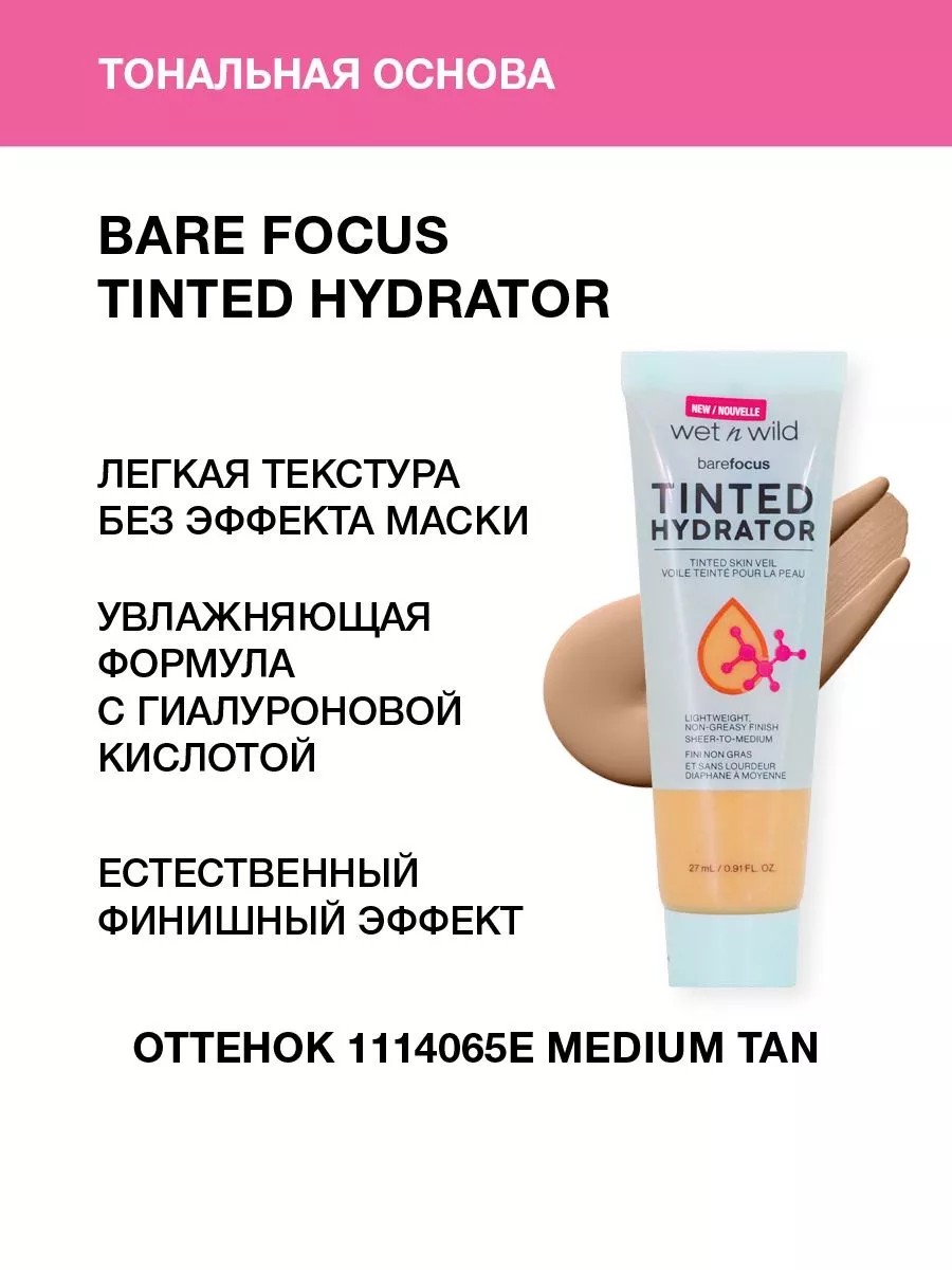 Тональный крем для лица Bare Focus Tinted Hydrator от официального дистрибьютора декоративной косметики wet n wild в РФ.Тональный крем Bare Focus Tinted Hydrator - секретное оружие для безупречной кожи. Содержит полезные уходовые ингредиенты, такие как: гиалуроновая кислота, а также растительный сквален и минералы, которые мгновенно увлажняют сухую кожу, сохраняя эффект в течение всего дня. При этом крем не вызывает раздражения на комбинированной и жирной коже. Кремовая, воздушная формула не только обеспечивает естественное покрытие, но и делает кожу более свежей, помогая улучшить ее текстуру. Тональное средство обладает естественным, сатиновым финишным эффектом и дает при послойном нанесении от легкого до среднего по плотности покрытие. Благодаря своей легкой текстуре, подойдет для антивозрастного макияжа. При наслаивании можно получить плотное кроющее покрытие без «залипаний», что отлично подойдет для макияжа на свадьбу, юбилей, день рождения или любые другие праздники.Попробуйте косметику для макияжа wet n wild, нас выбирают, как профессиональные визажисты, так и миллионы женщин и девушек по всему миру.Попробуйте тональную основу Bare Focus Tinted Hydrator в сочетании с нашими базами-сыворотками для лица, например, такими как матирующая основа для макияжа Prime Focus арт.131678266 или увлажняющая ухаживающая база-сыворотка для лица арт. 108745821, а также нашу знаменитую пудру для лица с матирующим эффектом Bare Focus. Придайте свежести лицу с помощью румян Color Icon Blush, создайте эффект «отдохнувшего на море лица» нашим бронзером Color Icon Bronzer, синяки под глазами с легкостью уберет консилер от wet n wild, а наш бестселлер – хайлайтер для лица MegaGlo Highlighting Powder сделает лицо сияющим. Ваш make up будет безупречным!Cruelty Free – не тестируется на животных. Vegan – не содержит продукты животного происхождения. Не содержит парабенов.