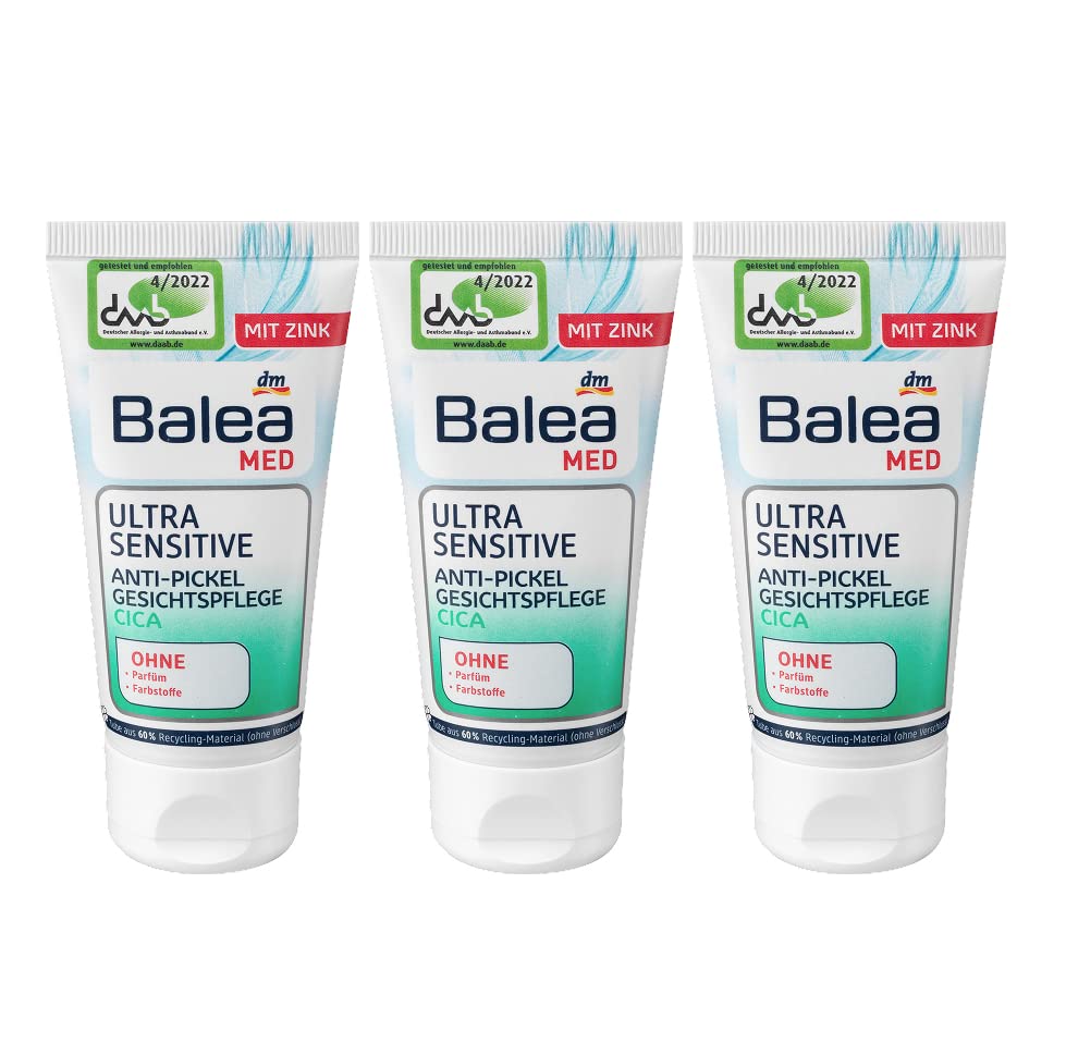 The Balea Med Ultra Sensitive anti-pimple facial care Cica is specially tailored to sensitive, impure skin. The combination of active ingredients effectively helps with skin impurities and has a calming effect at the same time. The formula with Cica helps relieve redness and itching due to skin impurities and promotes an intact skin structure. The combination of zinc and panthenol supports skin hydration and the disappearance of pimples. Allantoin and glycyrhetinic acid support the soothing effect of the skin. Instructions for use: Apply to face, neck and décolleté in the morning and evening after cleansing and massage gently. Avoid the eyes. Also ideal as a make-up underlay. Ingredients: AQUA, GLYCERIN, DIPROPYLHEPTYL CARBONATE, CETYL ALCOHOL, DICYLYL ETHER, GLUCOMANNAN, PANTHENOL, HYDROXYACETOPHENONE, SODIUM STEAROYL GLUTAMATE, DISTARCH PHOSFIATE, ALLANTOIN, DIPOTASSIUM GLYCYRRHIER ZATE, 1,2-hexanediol, ylylylyl glycol, zinc pca, tocopherol, chloro-Crispus powder, made cassoside, lactic acid. Made for: dm-drierie markt GmbH Co. KG, Am dm-Platz 1, 76227 Karlsruhe. INGREDIENTS AQUA, GLYCERIN, DIPROPYLHEPTYL CARBONATE, CETYL ALCOHOL, DICYLYL ETHER, GLUCOMANNAN, PANTHENOL, HYDROXYACETOFENONE, SODIUM STEAROYL GLUTAMATE, DISTERCH PHOSFIATE, ALLANTOIN, DIPOTASSIUM GLYYYLIUM RRHIZATE, 1,2-hexanediol, ylylylylyl glycol, zinc PCA, Tocoperol, Chondrus Crispus powder, madecassoside, lactoid oxygen. SAFETY WARNING Avoid contact with eyes and mucous membranes. Use only on intact skin. Avoid direct sunlight. Do not store above 25 degrees Celsius. Keep out of reach of children See moreProduct properties: particularly suitable for the face, without alcohol, without aluminum salts, without dyes, without preservatives, without nanoparticles, without parabens, without paraffin mineral oils, without perfume, pH skin neutral, sensitive care, vegan. Cleansing and regenerating. With glycyrrhetinic acid and allantoin. Specially for sensitive skin. Helps with skin impurities and has a calming effect. Without perfume, parabens, dyes. Balea Med Ultra Sensitive facial care with cica, anti-pimples, pack of 3 (3 x 50 ml) 150 ml.Balea Med Ultra Sensitive Gezichtsverzorging voor gevoelige huid, met cica, zonder parfum, parabenen, kleurstoffen, verpakking van 3 (3 x 50 ml), 150 ml De Balea Med Ultra Sensitive anti-puistjes gezichtsverzorging Cica is speciaal afgestemd op de gevoelige, onzuivere huid. De combinatie van werkzame stoffen helpt effectief bij onzuiverheden van de huid en werkt tegelijkertijd kalmerend. De formule met Cica helpt roodheid en jeuk bij onzuiverheden van de huid te verlichten en bevordert een intacte huidstructuur. De combinatie van zink en panthenol ondersteunt de hydratatie van de huid en het verdwijnen van puistjes. Allantoïne en glycyrhetinezuur ondersteunen de kalmerende werking van de huid. Gebruiksaanwijzing: 's ochtends en 's avonds na het reinigen op gezicht, hals en decolleté aanbrengen en zachtjes inmasseren. Vermijd de ogen. Ook ideaal als make-up-onderlegger. Ingrediënten: AQUA, GLYCERIN, DIPROPYLHEPTYL CARBONATE, CETYL ALCOHOL, DICYLYL ETHER, GLUCOMANNAN, PANTHENOL, HYDROXYACETOPHENONE, SODIUM STEAROYL GLUTAMATE, DISTARCH FOSFIATE, ALLANTOIN, DIPOTASSIUM GLYCYRRHIER ZATE, 1,2-hexanediol, ylylylyl glycol, zink pca, tocopherol, chloor-Crispus-poeder, made cassoside, lactisch zuur. Gemaakt voor: dm-drogerie markt GmbH Co. KG, Am dm-Platz 1, 76227 Karlsruhe. INGREDIËNTEN AQUA, GLYCERIN, DIPROPYLHEPTYL CARBONATE, CETYL ALCOHOL, DICYLYL ETHER, GLUCOMANNAN, PANTHENOL, HYDROXYACETOFENONE, SODIUM STEAROYL GLUTAMATE, DISTERCH FOSFIATE, ALLANTOINE, DIPOTASSIUM GLYYYLIUM RRHIZATE, 1,2-hexanediol, ylylylylyl glycol, zink PCA, Tocoperol, Chondrus Crispus-poeder, madecassoside, lactoïde zuurstof. VEILIGHEIDSWAARSCHUWING Vermijd contact met ogen en slijmvliezen. Alleen gebruiken op intacte huid. Vermijd direct zonlicht. Niet boven 25 graden Celsius bewaren. Buiten het bereik van kinderen houden Meer bekijkenProducteigenschappen: bijzonder geschikt voor het gezicht, zonder alcohol, zonder aluminiumzouten, zonder kleurstoffen, zonder conserveringsmiddelen, zonder nanodeeltjes, zonder parabenen, zonder paraffine minerale oliën, zonder parfum, pH-huidneutraal, gevoelige verzorging, veganistisch. Reinigend en regenererend. Met glycyrrhetinezuur en allantoïne. Speciaal voor de gevoelige huid. Helpt bij onzuiverheden van de huid en heeft een kalmerend effect. Zonder parfum, parabenen, kleurstoffen. Balea Med Ultra Sensitive gezichtsverzorging met cica, anti-puistjes, verpakking van 3 (3 x 50 ml) 150 ml.
