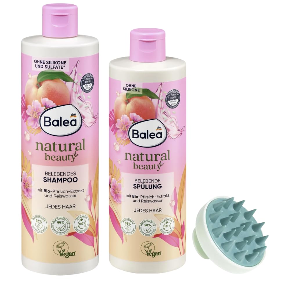 Whale Balea Natural Beauty Invigorating shampoo & conditioner set with organic peach extract and rice water + scalp massage brush for hair growth and blood circulation