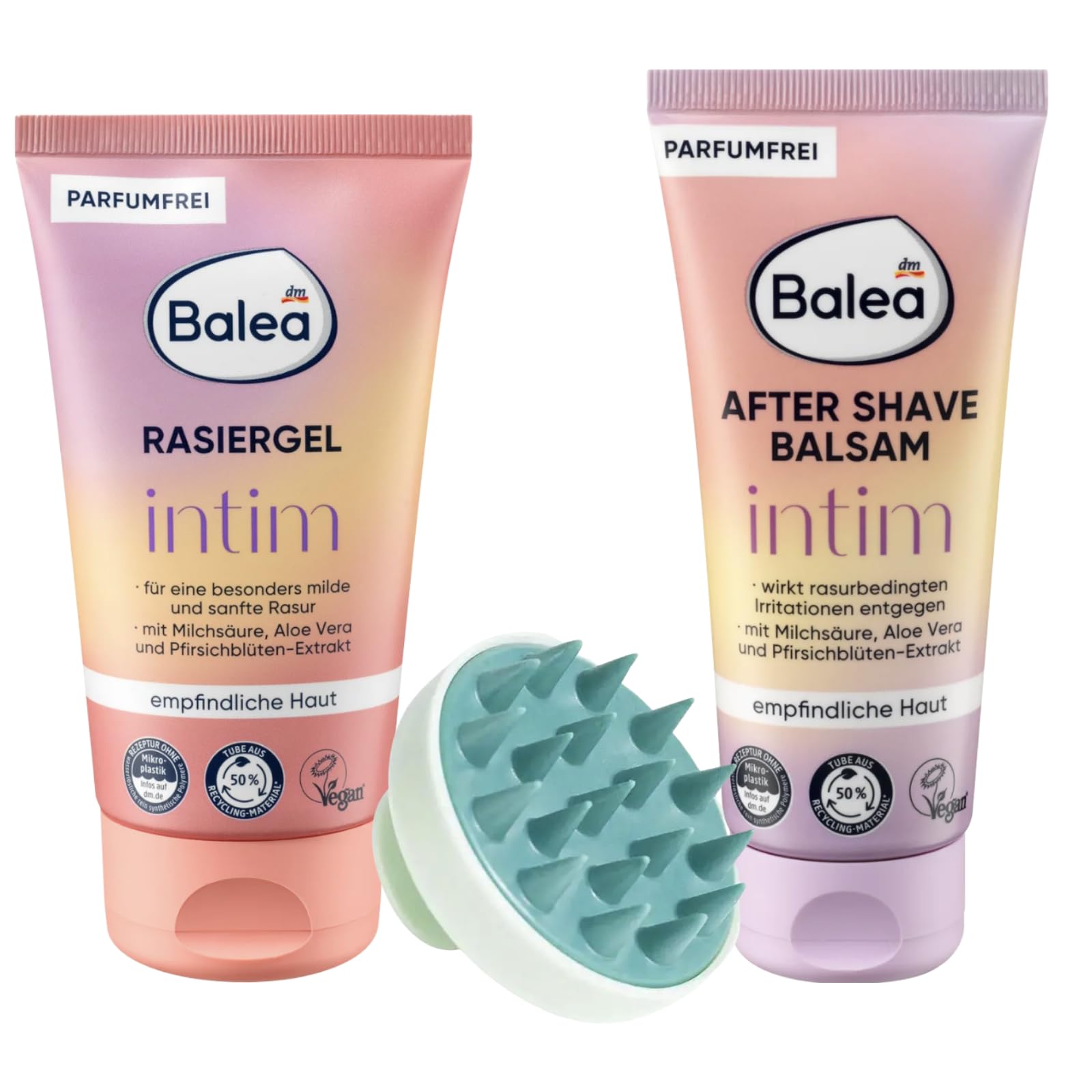 Balea Scheergel intiem, 150 ml Balea aftershave balsem intiem, 100 ml massageborstel voor haargroei en bloedcirculatie