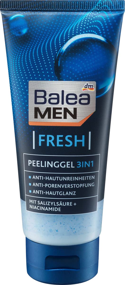 Balea Men Fresh Peeling Gel, 100 ml: The Balea Men Fresh Peeling Gel 3-in-1 provides a fresh skin feeling and vital appearance: Micropeeling particles open clogged pores and gently remove dead skin cells, while salicylic acid has an antibacterial effect and removes excess sebum. The highly effective formula effectively combats pimples such as blackheads and gives an even, shiny skin. Instructions for use: Apply to damp skin 1-2 times a week. Massage gently in circles. Avoid the eyes. Rinse with warm water. Do not use in case of acne or extensive veins. Ingredients: AQUA I GLYCINE SOY OIL I PUMICE I CETEARYL ALCOHOL I GLYCERIN I STEARIC ACID I PERSEA FREE SSIMA OIL I PRUNUS ARMENIACA KERNEL OIL I CETYL ALCOHOL I HYDROGENATED STARCH HYDROLYSATE I CETIE I CETIE I CETIE I TEARYL GLUCOSIDE I PHENOXYETHANOL I MAGNESIUM ALUMINUM SILICATE I SODIUM CETEARYL SULFATE I SODIUM BENZOATE I GLYCERYL STEARATE I GLYCERYL OLEATE I CITRIC ACID. Made for: dm-drierie markt GmbH Co. KG, at dm location 1, 76227 Karlsruhe. SAFETY WARNING Avoid contact with eyes and mucous membranes. Use only on intact skin. Avoid direct sunlight. Do not store above 25 degrees Celsius. Keep out of reach of childrenBalea Men Fresh Peeling Gel, 100 ml.Peelinggel voor mannen, gezichtsreiniging, met salicylzuur niacinamide, anti-poriënverstopping, anti-onzuiverheden, voor elk huidtype, 100 ml Balea Men Fresh Peeling Gel, 100 ml: De Balea Men Fresh Peelinggel 3-in-1 zorgt voor een fris huidgevoel en vitaal uiterlijk: Micropeeling-deeltjes openen de verstopte poriën en verwijderen voorzichtig dode huidcellen, terwijl salicylzuur antibacterieel werkt en overtollig talg verwijdert. Zo werkt de zeer effectieve formule effectief puistjes zoals mee-eters tegen en geeft een gelijkmatige, glanzende huid. Gebruiksaanwijzing: 1-2 keer per week op de vochtige huid aanbrengen. Zacht cirkelend inmasseren. Vermijd de ogen. Met warm water afspoelen. Niet gebruiken bij acne of uitgebreid adertje. Ingrediënten: AQUA I GLYCINE SOJA OIL I PUMICE I CETEARYL ALCOHOL I GLYCERIN I STEARIC ACID I PERSEA GRATIS SSIMA OIL I PRUNUS ARMENIACA KERNEL OIL I CETYL ALCOHOL I HYDROGENATED STARCH HYDROLYSATE I CETIE I CETIE I CETIE I TEARYL GLUCOSIDE I PHENOXYETHANOL I MAGNESIUM ALUMINUM SILICATE I SODIUM CETEARYL SULFATE I SODIUM BENZOATE I XANTHAN GLOM I LACTIC ACID I LAURYL GLUCOSIDE I POTASSIUM SORBATE I ETHYLHEXYLGLGLYLGLGLGLL YCERIN I LECITHIN I TOCOPHEROL, ASCORBYL PALMITATE I GLYCERYL STEARATE I GLYCERYL OLEATE I CITRIC ACID. Gemaakt voor: dm-drogerie markt GmbH Co. KG, op dm-plaats 1, 76227 Karlsruhe. VEILIGHEIDSWAARSCHUWING Vermijd contact met ogen en slijmvliezen. Alleen op intacte huid gebruiken. Vermijd direct zonlicht. Niet boven 25 graden Celsius bewaren. Buiten het bereik van kinderen houdenBalea Men Fresh Peeling Gel, 100 ml.