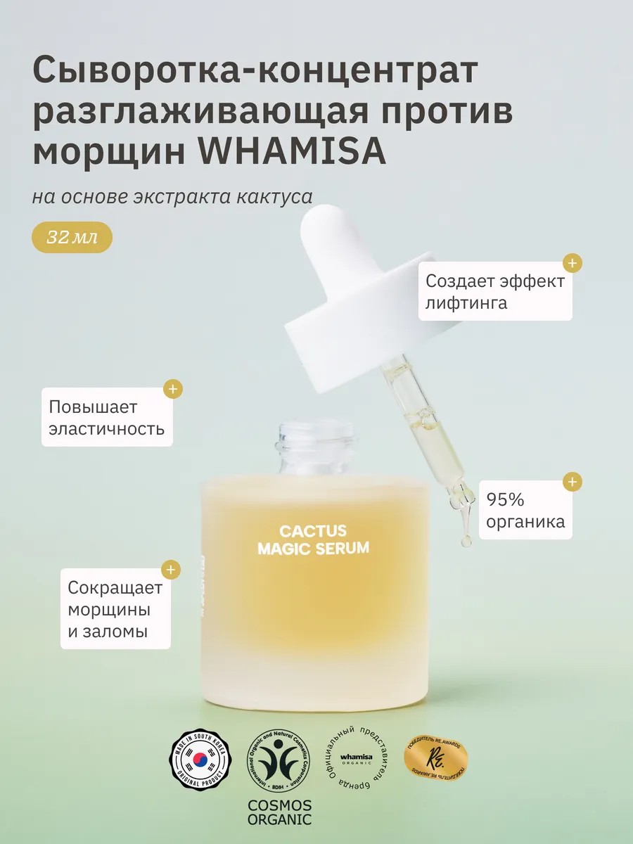 Сыворотка WHAMISA - сочетает в себе увлажнение, питание и восстановление. Формула содержит Экстракт опунции (кактуса), который глубоко насыщает клетки влагой и борется с сухостью. Подходит для сухой, чувствительной, проблемной, комбинированной и жирной кожи, обеспечивая эффект выравнивания тона и сияния. Компоненты в составе активируют процессы омоложения (Anti-age) благодаря содержанию солодки, пиона, аденозина. Помогают уменьшить выраженность морщин и предотвращают их появление. Экстракт семян пажитника сенного усиливает упругость кожи, а натуральная основа способствует восстановлению структуры клеток.