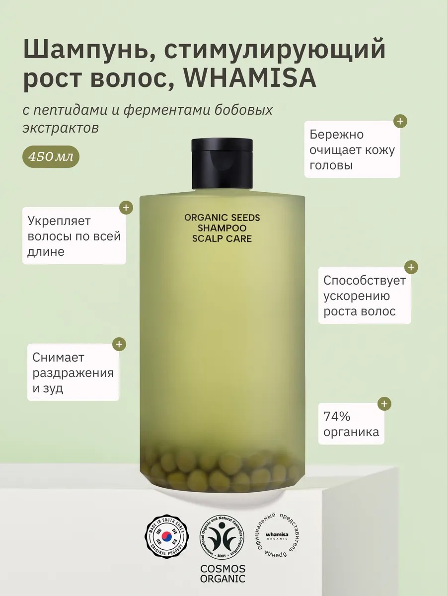 Шампунь WHAMISA стимулирующий рост волос, с пептидами и ферментами бобовых экстрактов- профессиональный уход за волосами каждый день и стимуляция роста. Проф средство направлено на глубокую очистку чувствительной кожи головы и ломких волос, легкое расчесывание непослушных, длинных и пушистых прядей, придание здорового блеска, укрепления и увлажнения. Также активатор быстрого роста, бережно очищает, укрепляет структуру и восстанавливает густоту волос. Восстанавливающий и увлажняющий мягкий шампунь без силиконов с натуральным составом. Пантенол (провитамин B5) обеспечивает питание и ламинирование пористых и поврежденных волос от корней. Экстракты семян (гороха, маша, сои, подсолнечника, пажитника) – богаты аминокислотами, пептидами и фитоэстрогенами, могут укреплять кожу/волосы, стимулировать синтез коллагена. Кофеин и аденозин борются против выпадения и дарят ускорение роста. Бетаин обеспечивает лечение и ламинирующий эффект: способствует выпрямлению, устранению ломкости и пушистости. Гималайская соль обладает противогрибковым эффектом, очищая от перхоти, питает волосяную луковицу, способствует усиленному росту. Кофеин в сочетании с ментолом стимулирует кровообращение кожи головы, проникает в структуру волоса и укрепляет изнутри, ускоряет рост, а также подавляет DHT — фермент, запускающий гормональное выпадение. Салициловая кислота глубоко очищает, способствует себорегуляции, успокаивает раздражение и зуд и является профилактикой от перхоти. Подходит для всех типов волос. Способ применения: нанести на влажные волосы питательный эко шампунь для роста волос, помассировать, чтобы лучше очистить кожу от загрязнений, смыть. Результат после использования: гладкость и блеск, предотвращение секущихся кончиков, устранение жирности и sos восстановление и активация роста. Органический шампунь с маслами (450 мл) подходит для всех типов волос: нормальных и комбинированных, жестких и волнистых, сухих и жирных, натуральных, темных, рыжих, густых, кудрявых и вьющихся, обесцвеченных блонд и мелированных, осветленных и окрашенных. Профессионал средство разработано для брюнеток и блондинок и седых прядей. Большой объем удобен для ванны и бани. Это салонный и домашний уход против облысения. WHAMISA – уходовая, натуральная, органическая, корейская косметика для мужчин и женщин. Рекомендован к применению с 12 лет. Идеальный подарок на День Рождения, 8 марта, Новый год, для Мамы, сестры, любимой девушки, подруги.