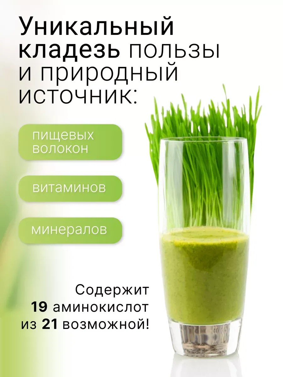 ВИТГРАСС - уникальный кладезь пользы и природный источник пищевых волокон, минералов, витаминов и других полезных природных веществ. В нем 19 аминокислот из 21 возможной! В составе только 100% сок органических ростков пшеницы, без ГМО и синтетических примесей. Сухой сок ростков пшеницы обладает теми же полезными свойствами, что и пророщенная пшеница и микрозелень. Натуральный eco порошок не содержит никаких добавок и вредных веществ, глютена, без сахара. Проростки пшеницы содержат высокий уровень (70%) растительного аналога гемоглобина — хлорофилла, который обновляет ткани на клеточном уровне. Происходит очищение крови, омоложение организма, вырабатывается коллаген, чувствуется прилив сил и энергии. Пророщенная пшеница - богатый источник клетчатки. Ее употребление быстро вызывает чувство насыщения и снижает аппетит, а пищеварительные ферменты полезны для желудка и кишечника. Высокая концентрация хлорофилла способствует расщеплению жировой ткани, поэтому витграс идеален для похудения, так как работает и как жиросжигатель. Микрозелень пшеницы содержит витамины А, С, РР, группы В (В1, B2, В3, В4, В5, В6, В7 В8, В12), Витамин С, Е, K, PP, бета-каротин, железо, магний, селен, холин, фосфор, кальций, калий, цинк, фолиевую кислоту, натрий, йод, серу. А ещё это источник полиненасыщенных Омега-3, 6, 9 кислот, играющих важную роль в поддержке здоровья сердечно-сосудистой системы, состояния кожи, волос, ногтей и натуральный антидепрессант. Порошок антиоксидант способствует детоксикации организма, оказывает мощный эффект детокс для похудения, выводит токсины. При его употреблении происходит очищение организма и чистка кишечника. Это лучший энергетик, который повышает стрессоустойчивость и выносливость. Сок ростков пшеницы активно насыщает все клетки организма кислородом, помогает в транспортировке кислорода и буквально помогая дышать каждой клеточке. Это повышает работоспособность всех органов, в т.ч. и головного мозга, укрепляет иммунитет и помогает бороться с хронической усталостью. Суперфуд поможет вести здоровый образ жизни (зож) и дополнить диетическое питание, кето диету, фитнес и веганскую еду. Пищевая добавка содержит только 100% растительные компоненты, подходит веганам и вегетарианцам, для худеющих и диабетиков, в пост. Так как это 100% сублимированный органический сок ростков пшеницы, порошок практически полностью растворяется в воде, имеет насыщенный зеленый оттенок и приятный запах. Витграсс порошок, в отличие от витграса в капсулах или таблетках, можно добавлять в любимую смесь семян для салатов, детские полезные завтраки, смузи, каши, detox коктейль.