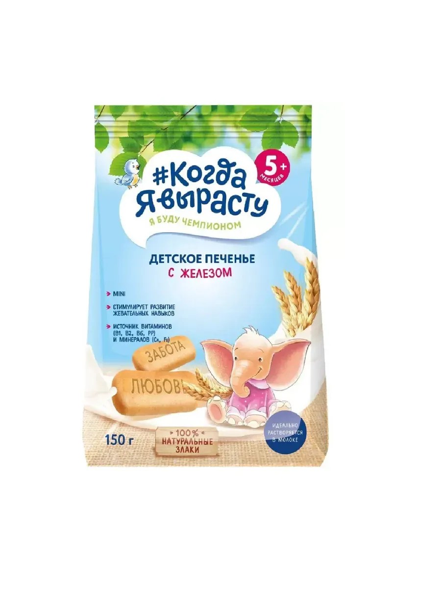 Когда Я вырасту, Печенье детское Обогащенное железом с 5-ти месяцев, 150г, 1 шт. Первый российский бренд для заботливых мам, которые выбирают для своих малышей полезные и безопасные продукты! Печенье обогащённое железом - это сбалансированный и полезный детский продукт питания или дополнительного прикорма для детей старше 5 месяцев. Разнообразные форматы печенья от мини-мини, которые так удобно держать маленькими детскими ручками, до стандартных с забавными надписями на каждом из них, превратят процесс питания в развлечение! Печенье производится на новейшем современном заводе с соблюдением высоких требований к качеству детского питания.
