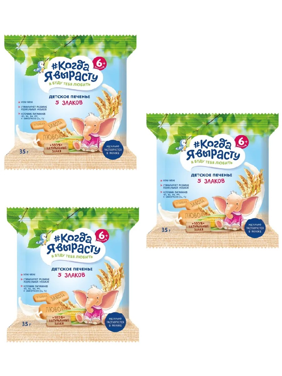 Когда Я вырасту, Печенье детское 5 злаков с 6-ти месяцев, 35г, 3 шт. Это сбалансированный и полезный детский продукт питания или дополнительного прикорма для детей старше 6 месяцев. Разнообразные форматы печенья от мини-мини, которые так удобно держать маленькими детскими ручками, до стандартных, с забавными надписями на каждом из них, превратят процесс питания в развлечение! Печенье производится на новейшем современном заводе с соблюдением высоких требований к качеству детского питания. Когда Я вырасту - первый российский бренд для заботливых мам, которые выбирают для своих малышей полезные и безопасные продукты!