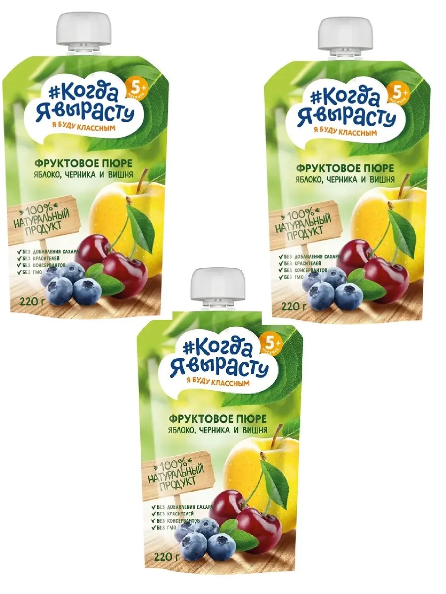 When I Grow Up - Fruit Puree "Apple, Blueberry, Cherry" is a balanced and healthy baby dessert, recommended for feeding children over 5 months. Puree is a favorite snack not only for babies and older children, but also for schoolchildren, teenagers, and adults who maintain a healthy lifestyle. Convenient, modern packaging - a pouch, fully preserves the beneficial properties of fruits, takes up little space in a purse and refrigerator, it is convenient to take on the road and on a walk! Puree is produced at the latest modern plant in compliance with the highest requirements for the quality of baby food. Recommendations for use: the product is ready to eat. For feeding children over 5 months, start feeding with 1 teaspoon 2 times a day, gradually increasing to 100g by 12 months. Do not heat up in the original packaging in the microwave. Do not leave the child alone during meals without supervision! Features: promotes the development of taste sensations; 100% natural ingredients, a healthy snack; no added sugar; homogenized, sterilized; no dyes or preservatives; non-GMO, no starch; pouch - convenient to take on the road/for a walk; can be eaten straight from the package. 3 pack.