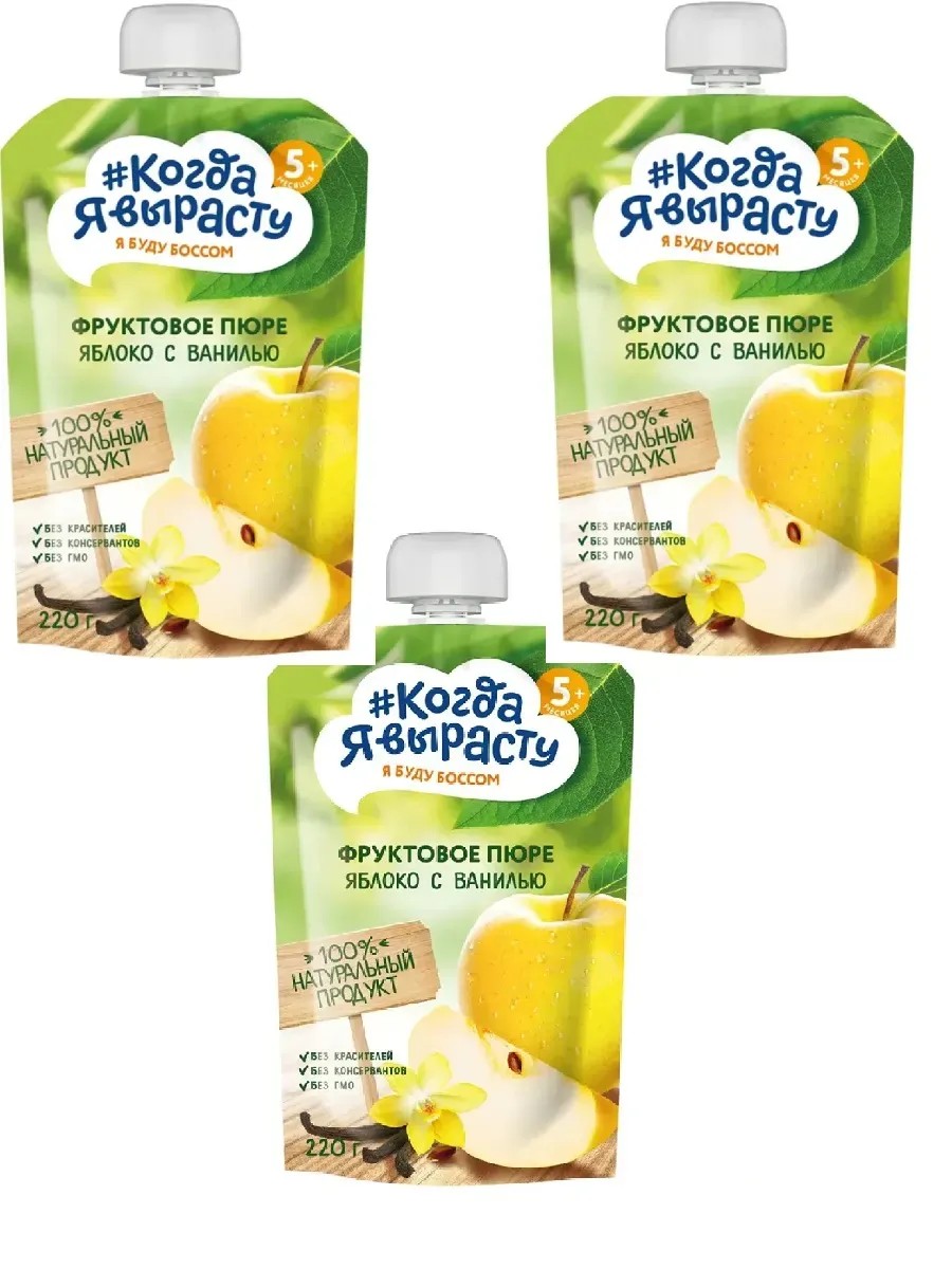 Детское питание фруктовое пюре Когда я вырасту яблоко с ванилью для питания детей с 5 месяцев в наборе из 2 шт по 220 грамм. Это сбалансированный и полезный детский десерт. Пюре - излюбленный перекус не только малышей и деток постарше, но и школьников, подростков, взрослых поддерживающих здоровый образ жизни. Удобная, современная упаковка - пауч, полностью сохраняет полезные свойства фруктов, занимает мало места в сумочке и холодильнике, её удобно брать в дорогу и на прогулку! Пюре производится на новейшем современном заводе с соблюдением высоких требований к качеству детского питания. Рекомендации по употреблению: продукт готов к употреблению. Для питания детей старше 5-и месяцев, начинайте прикорм с 1 чайной ложки 2 раза в день, постепенно увеличивая к 12 месяцам до 100г. 3уп