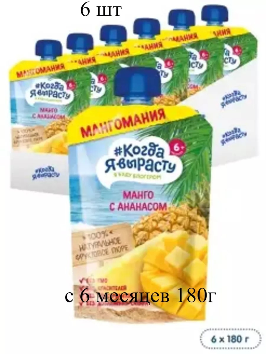 Когда Я вырасту - первый российский бренд для заботливых мам, которые выбирают для своих малышей полезные и безопасные продукты! Фруктовое пюре "Манго, ананас" - это сбалансированный и полезный десерт, рекомендован для питания детей старше 6 месяцев. Серия пюре Мангомания отличается повышенным содержанием в составе пюре экзотических фруктов. Однородная (гомогенизированная) консистенция прекрасно передает вкус и полезные свойства фруктов. Наслаждайтесь вкусами лета! Большая упаковка пюре (180 грамм) - излюбленный перекус не только малышей и деток постарше, но и школьников, подростков, взрослых, соблюдающих здоровый образ жизни. Удобная, современная упаковка - пауч, полностью сохраняет свойства фруктов, занимает мало места в сумочке и холодильнике, её удобно брать в дорогу и на прогулку!