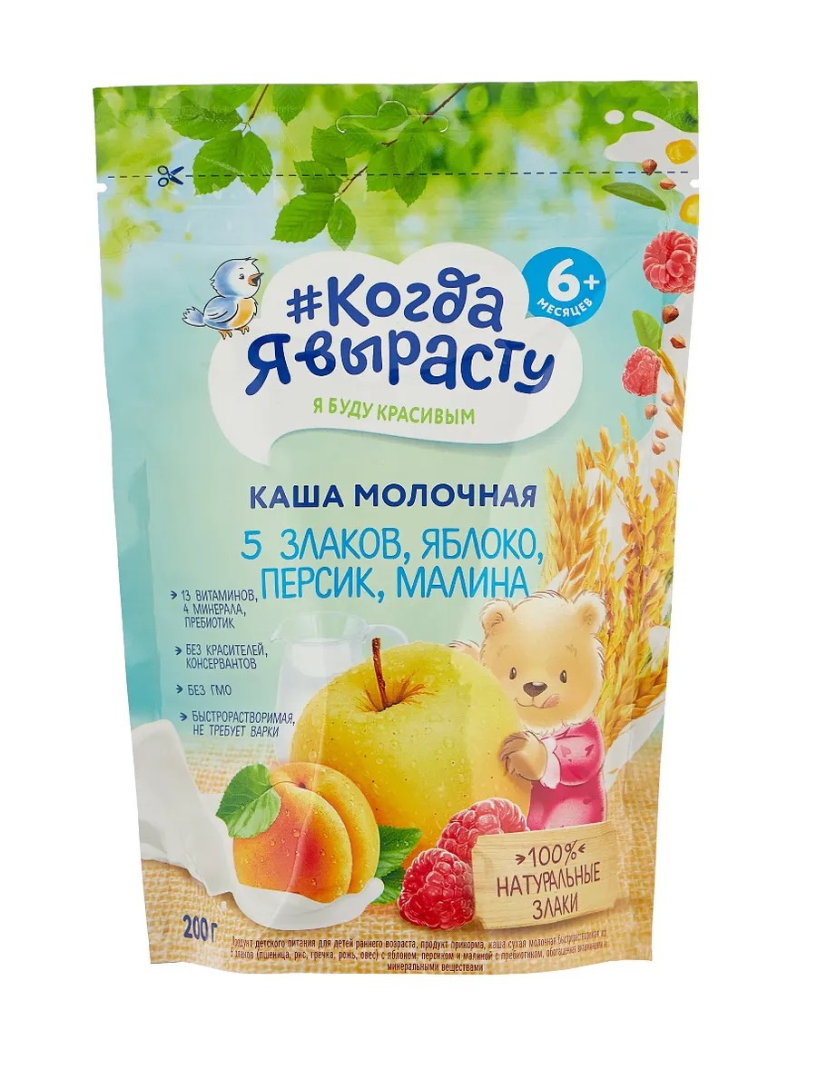 Когда я вырасту, каша молочная 5 Злаков, с 6 мес., 200г. Каша Когда я вырасту, 5 злаков молочная, яблоко, персик, малина - это сбалансированный и полезный продукт детского питания, рекомендованный для питания детей старше 6 месяцев. Каша обогащена пребиотиком, для улучшения пищеварения, а так же витаминами и минеральными веществами, так необходимыми малышу в этом возрасте. Каша производится на новейшем современном заводе с соблюдением высоких требований к качеству детского питания.