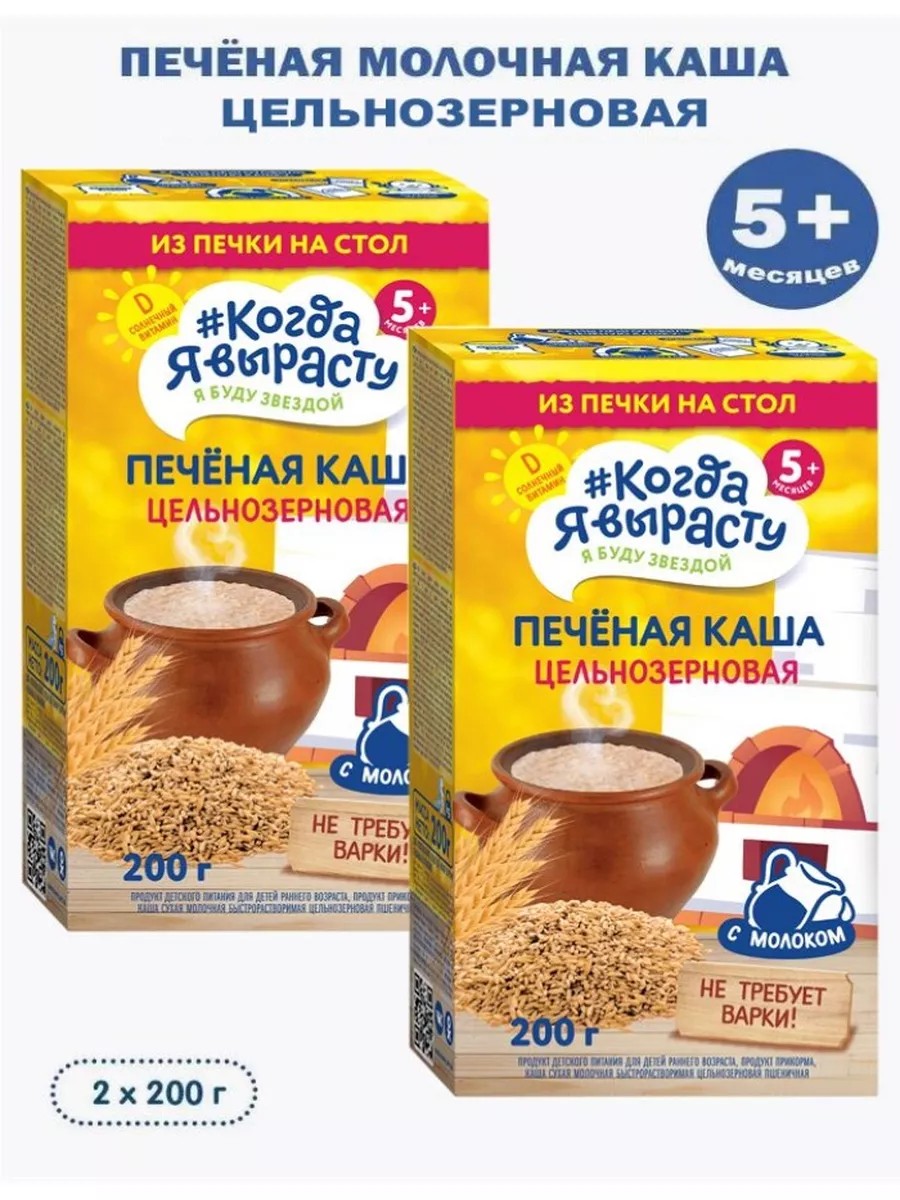Когда Я вырасту - первый российский бренд для заботливых мам, которые выбирают для своих малышей полезные и безопасные продукты! Молочная быстрорастворимая печёная каша детская "Цельнозерновая" - это сбалансированный и полезный продукт детского питания, рекомендованный для питания детей старше 5 месяцев. Печёные каши бренда # Когда я вырасту - это уникальная технология производства детских быстрорастворимых каш, когда после бережного смешивания ингредиентов готовая каша запекается в печи, что придает продукту особенный вкус и позволяет сохранить полезные свойства ингредиентов. Каша производится на новейшем современном заводе с соблюдением высоких требований к качеству детского питания. Способ приготовления: налейте в посуду для кормления 100 мл прокипяченной воды, остуженной до температуры 60°С, далее добавьте 40 г (примерно 3-4 столовые ложки) сухого продукта, тщательно перемешайте, дайте настояться 3 минуты и остудите приготовленный продукт до температуры 37°С.