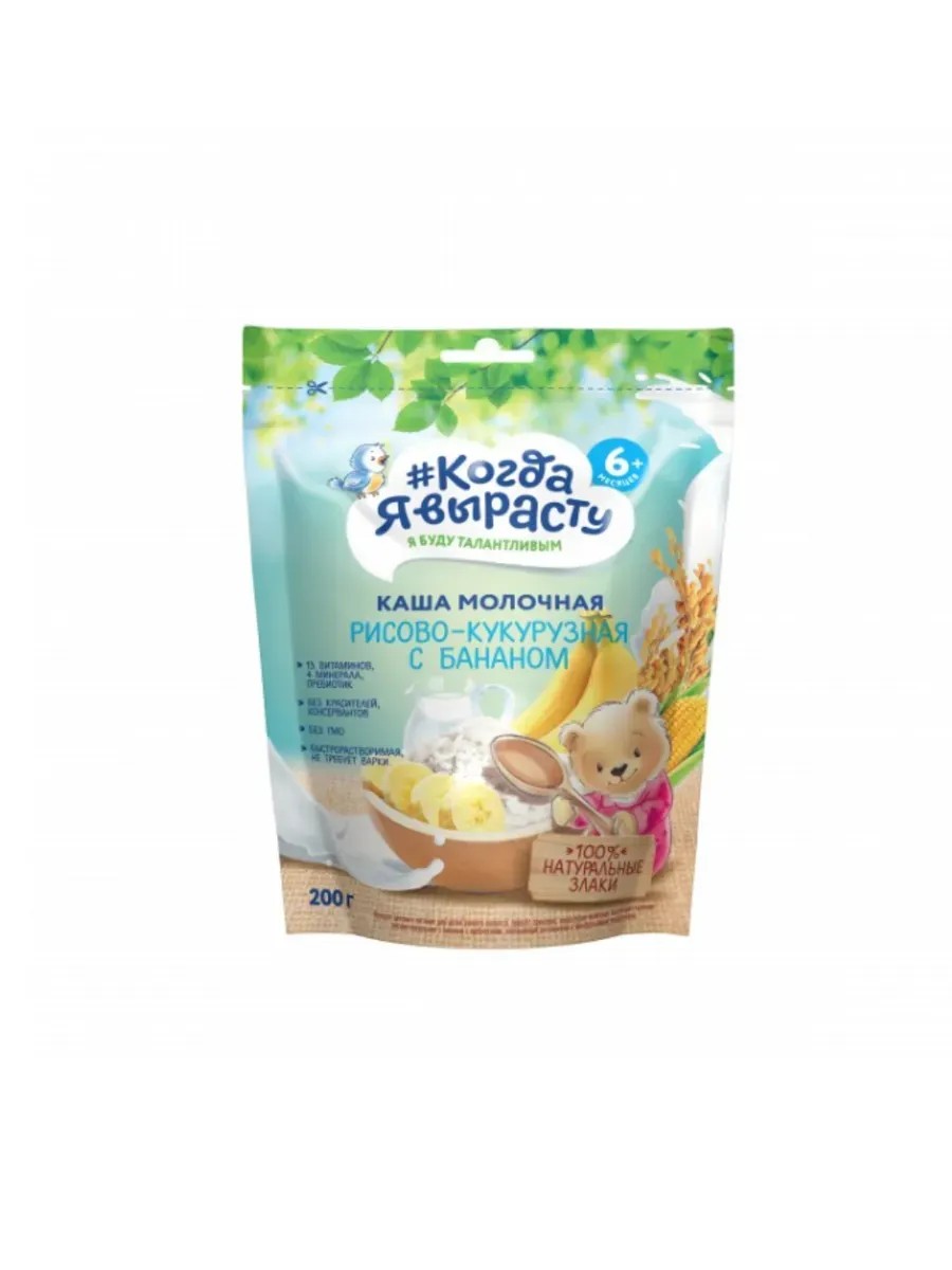 Когда Я вырасту Каша молочная Рис Кукуруза Банан с 6 мес. 200 г. Это сбалансированный и полезный продукт детского питания, рекомендованный для питания детей старше 6 месяцев. Каша обогащена пребиотиком, для улучшения пищеварения, а так же витаминами и минеральными веществами, так необходимыми малышу в этом возрасте. Каша производится на новейшем современном заводе с соблюдением высоких требований к качеству детского питания. Способ приготовления: налейте 80 мл прокипяченной, а затем охлажденной до 40-50 ºС воды; постепенно добавьте в воду 20 г (4-5 столовых ложек без верха) сухой каши; тщательно перемешайте до однородной массы и остудите до температуры комфортной для кормления ребенка. Начинайте вводить кашу в прикорм постепенно с 1 чайной ложки готового продукта. После приготовления каши плотно закройте упаковку. Рекомендуется готовить кашу непосредственно перед каждым приемом пищи. Не подогревать в микроволновой печи. Состав: молоко сухое цельное, мука рисовая, мука кукурузная, пюре банановое, сахарная пудра, пребиотик-инулин, соль, витаминно-минеральный премикс (С (L-аскорбиновая кислота), железа (II) фумарат, E (DL-альфа-токоферола ацетат), ниацин (никотинамид), цинка оксид, пантотеновая кислота (D-пантотенат кальция), B6 (пиридоксин гидрохлорид), B2 (рибофлавин), В1 (тиамина мононитрат), A (ретинола ацетат), фолиевая кислота, йодид калия, D (D3 холекальциферол), биотин (D-биотин), K (филлохинон), B12 (цианкобаламин)), ароматизатор: экстракт ванили.