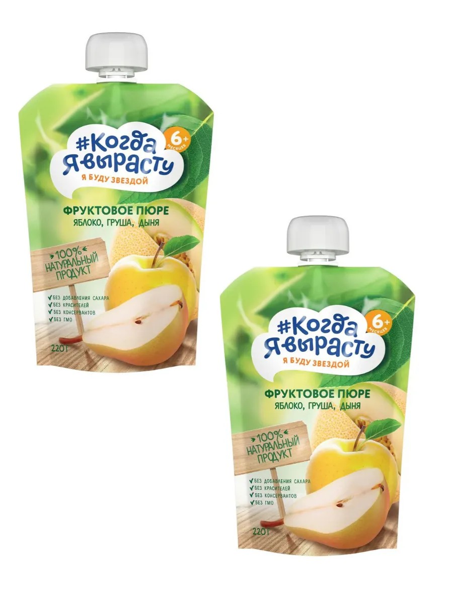 Когда Я вырасту, Пюре фруктовое Яблоко-Груша-Дыня без сахара для детей с 6месяцев, 220г, 2 шт. Это сбалансированный и полезный детский десерт, рекомендован для питания детей старше 6 месяцев. Пюре - излюбленный перекус не только малышей и деток постарше, но и школьников, подростков, взрослых поддерживающих здоровый образ жизни. Удобная, современная упаковка - пауч, полностью сохраняет полезные свойства фруктов, занимает мало места в сумочке и холодильнике, её удобно брать в дорогу и на прогулку! Пюре производится на новейшем современном заводе с соблюдением высоких требований к качеству детского питания. Состав: пюре яблочное, пюре из груш, сок дыни. Гомогенизированное, стерилизованное. Изготовлено из концентрированного пюре. Содержит сахара природного (естественного) происхождения.