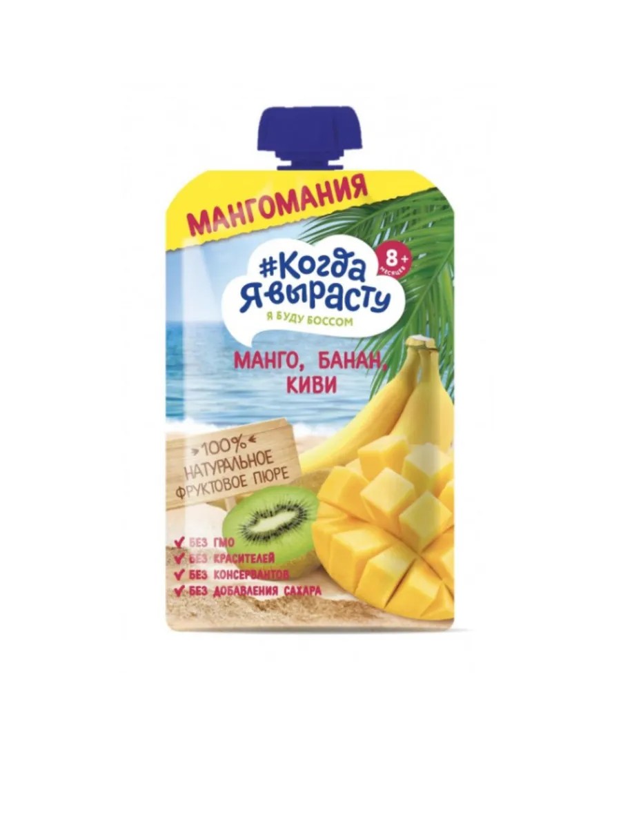 When I Grow Up Homogenized Puree Apple, Mango, Banana, Kiwi 180g. When I Grow Up is the first Russian brand for caring mothers who choose healthy and safe products for their babies! Mango, Banana, Kiwi fruit puree is a balanced and healthy dessert, recommended for children over 8 months. The Mangomania puree series is distinguished by its increased content of exotic fruits. The uniform homogenized consistency perfectly conveys the flavor and beneficial properties of the fruits. Enjoy the flavors of summer!