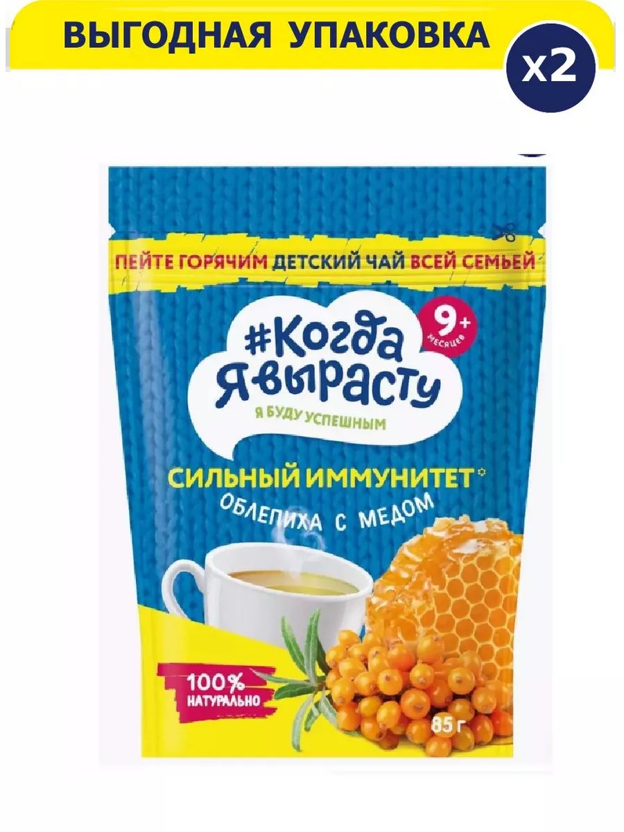 Когда Я вырасту - первый российский бренд для заботливых мам, которые выбирают для своих малышей полезные и безопасные продукты! Чай детский "Сильный иммунитет" с облепихой и мёдом - это полезный детский напиток для детей старше 9 месяцев. Инстантный (быстрорастворимый) чай великолепно растворяется в воде, обладает легкой сладостью и вкусами облепихи и мёда. Сочетания полезных ягод, натуральных экстрактов и пюре делают чай особенно полезен в холодное время года. Пейте чай горячим всей семьёй!Удобная и герметичная упаковка (Doypack) позволяет сохранять свойства напитка на протяжении всего периода потребления. Доступная цена, оптимальный объем упаковки и высокое качество - вот отличительные особенности детского чая Когда Я вырасту. Чай производится на новейшем современном заводе с соблюдением высоких требований к качеству детского питания.