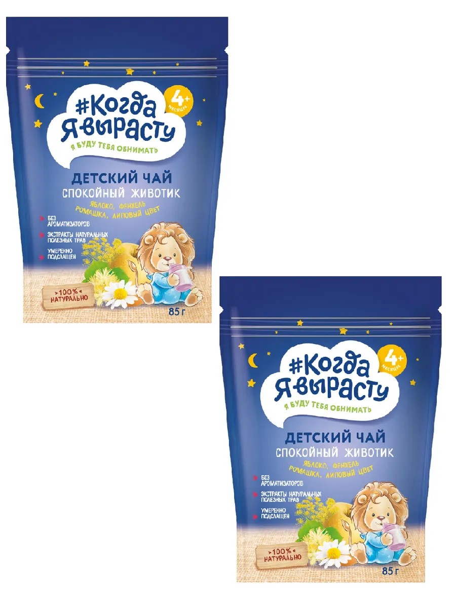 Когда Я вырасту, Чай гранулированный Спокойный животик для детей с 4месяцев, 85г, 2 шт. Первый российский бренд для заботливых мам, которые выбирают для своих малышей полезные и безопасные продукты! Чай детский "Спокойный животик" с яблоком, фенхелем, ромашкой и липовым цветом - это полезный детский напиток для детей старше 4 месяцев. Инстантный (быстрорастворимый) чай великолепно растворяется в воде, обладает легким ароматом яблока, фенхеля, ромашки, липового цвета и умеренной сладостью. Фенхель, липовый цвет способствуют снижению колик, спазмов и газообразования. Ромашка оказывает противовоспалительное и успокаивающее действие. Удобная и герметичная упаковка (Doypack) позволяет сохранять свойства напитка на протяжении всего периода потребления.