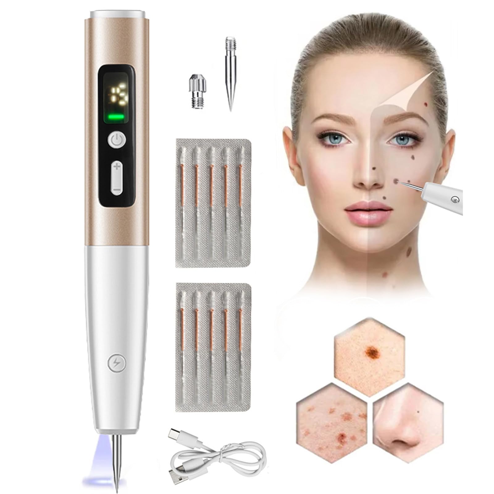 Product features: -- Safe and effective Removal of moles and freckles, according to a physical principle, safe and effective. Quickly removes surface and internal pigments, effectively removing moles, skin growths, freckles, warts, pigment spots and dark spots. -- Easy operation Turn on the removal pen, long press the power button, select the desired speed and gently move the tip from back to front over the area to be treated. Keep the skin taut during the treatment. Specifications: Material: plastic hardware Colour: silver Gear: 15 gears Lamp: Searchlight, blue Input voltage: 5 V Output power: 2W Power interface: type-C Charging time: about one hour How long does the battery last: about an hour Battery capacity: 800mAh Battery name: lithium battery Whether there is power failure protection: yes Net weight: 78g Product dimensions: 19 x 3 x 2.8 cm Package size: 21.8 x 10 x 3.5 cm Included in the package: 1 x Mole Point Pen 1 x Thick needle 10 x Fine needles 1 x USB charging cable 1 x English manualOUR SERVICES Do you have any questions? Please contact us. We will contact you within 24 hours. Don't hesitate to scroll above and click "Add to Cart" to purchase this fantastic quality product immediately!. MENALIZED DESIGN The non-slip handle has soft lines design and comfortable grip the LCD screen clearly shows you the position of the gears The illuminated design on the bottom helps us better identify the stains to be removed. WIDE APPLICATION Unlike the traditional drug mole removal method, this mole detection pen uses physical methods to safely and quickly remove moles, warts, granulation, freckles, age spots, tattoos, fat particles, etc. 15 GEAR INTENSITIES 15 adjustment levels, efficient removal of moles and pimples of different sizes, precise control of different moles, a wider range of applications, to meet your different needs. SAFE AND EFFECTIVE Using ionized carbonization technology, the device physically removes moles and pimples, safely and painlessly, without side effects and without rebound, leaving your skin smooth and clean.Plasmapen met 15 niveaus, verwijdering van moedervlekken,wratten,donkere vlekken,zwarte stippen,naevus,sproeten,platte vlekken, puistjes, huidlabels, veilig en pijnloos, met display en licht,Gold Productkenmerken: -- Veilig en effectief Verwijdering van moedervlekken en sproeten, volgens een fysisch principe, veilig en effectief. Verwijdert snel oppervlakte- en inwendige pigmenten, waardoor moedervlekken, huidgroei, sproeten, wratten, pigmentvlekken en donkere vlekken effectief worden verwijderd. -- Eenvoudige bediening Zet de verwijderingspen aan, druk lang op de aan uit-knop, selecteer de gewenste snelheid en beweeg de punt voorzichtig van achter naar voren over het te behandelen gebied. Houd de huid strak tijdens de behandeling. Specificaties: Materiaal: kunststof hardware Kleur: zilver Versnelling: 15 versnellingen Lamp: Zoeklicht, blauw Ingangsspanning: 5 V Uitgangsvermogen: 2 W Voedingsinterface: type-C Oplaadtijd: ongeveer een uur Hoe lang gaat de batterij mee: ongeveer een uur Batterijcapaciteit: 800 mAh Batterijnaam: lithiumbatterij Of er stroomuitvalbeveiliging is: ja Nettogewicht: 78 g Productafmetingen: 19 x 3 x 2,8 cm Verpakkingsgrootte: 21,8 x 10 x 3,5 cm Inbegrepen in het pakket: 1 x Molpuntpen 1 x Dikke naald 10 x Fijne naalden 1 x USB-oplaadkabel 1 x Engelse handleidingONZE DIENSTEN Heeft u vragen? Neem dan contact met ons op. We nemen binnen 24 uur contact met u op. Aarzel niet om bovenaan te bladeren en op "Toevoegen aan winkelwagen" te klikken om dit fantastische kwaliteitsproduct direct te kopen!. GEMENSALISEERD ONTWERP De antislip handgreep heeft een zacht lijnenontwerp en comfortabele grip het lcd-scherm geeft u duidelijk de positie van de tandwielen weer het verlichte ontwerp aan de onderkant helpt ons de te verwijderen vlekken beter te identificeren. BREDE TOEPASSING In tegenstelling tot de traditionele methode voor het verwijderen van moedervlekken met medicijnen, gebruikt deze pen voor het detecteren van moedervlekken fysieke methoden om veilig en snel moedervlekken, wratten, granulatie, sproeten, ouderdomsvlekken, tatoeages, vetdeeltjes, enz. te verwijderen. 15 VERSNELLINGSINTENSITEITEN 15 instelniveaus, efficiënte verwijdering van moedervlekken en puistjes van verschillende groottes, nauwkeurige controle van verschillende moedervlekken, een breder scala aan toepassingen, om aan uw verschillende behoeften te voldoen. VEILIG EN EFFECTIEF Met behulp van geïoniseerde carbonisatietechnologie verwijdert het apparaat moedervlekken en puistjes fysiek, veilig en pijnloos, zonder bijwerkingen en zonder rebound, waardoor uw huid glad en schoon blijft.