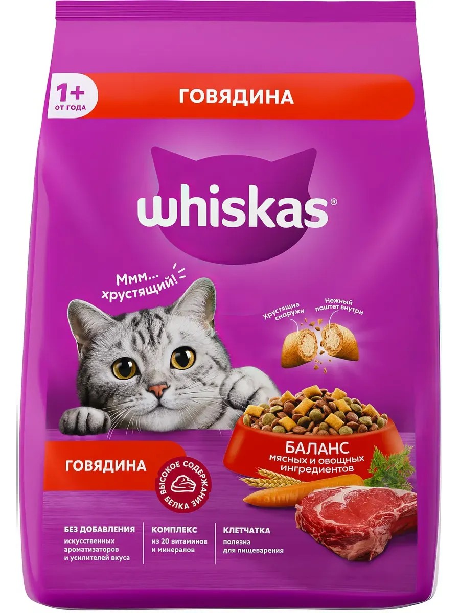 Корм Whiskas для кошек, подушечки с нежным паштетом, говядина, 1.3 кг. Корм Whiskas для кошек, подушечки с нежным паштетом, говядина Это сбалансированный рацион для здоровой и счастливой жизни Вашей кошки. Хрустящие подушечки с нежным паштетом внутри обязательно придутся по вкусу Вашей любимице. Кроме того, Whiskas содержит все необходимое, чтобы еда Вашей кошки была не только вкусной, но и полезной.. Whiskas это: Оптимальное сочетание питательных веществ и нутриентов для подержания обмена веществ Витамин Е и цинк для иммунитета Омега-6 и цинк для здоровья кожи и шерсти Баланс кальция и фосфора для здоровья костей Витамин А и таурин для хорошего зрения Высокоусваиваемые ингредиенты и клетчатка для пищеварения Сухая текстура корма для удаления зубного налета Состав: злаки и продукты их переработки, мука животного происхождения (в том числе из говядины), растительные белковые экстракты, животные жиры и растительные масла (в том числе подсолнечное масло), гидролизат из продуктов животного происхождения, минеральные вещества, витамины, свекловичный жом, пивные дрожжи, аминокислоты (в том числе таурин), красители, морковь сушеная, антиоксиданты. Добавленные вещества (кг) : витамин D3 - 2000 МЕ, таурин - 1700 мг, цинк - 174 мг, железо - 51 мг. Витамин А - 600 МЕ; витамин Е - 7,0 мг; кальций - 1,6 г; фосфор - 1,2 г. Содержание питательных веществ (100 г) : белок - 32 г; жир - 11,5 г; зола - 8,5 г; клетчатка - 1,5 г; влажность - не более 10 г. Энергетическая ценность (100 г) 365 Ккал / 1526 кДж Рекомендации по кормлению: Whiskas рекомендует сочетать разные форматы корма в рационе Вашей кошки. Утром и вечером Вашей любимице нужно давать влажный рацион, а в течение дня сухой. Это позволит объединить преимущества каждого из форматов, ведь ее рацион должен быть не только вкусным, но и полезным. Нужно помнить, что смешивать в одной миске сухой и влажный рационы не рекомендуется. Кроме того, у вашей любимицы всегда должен быть доступ к чистой питьевой воде