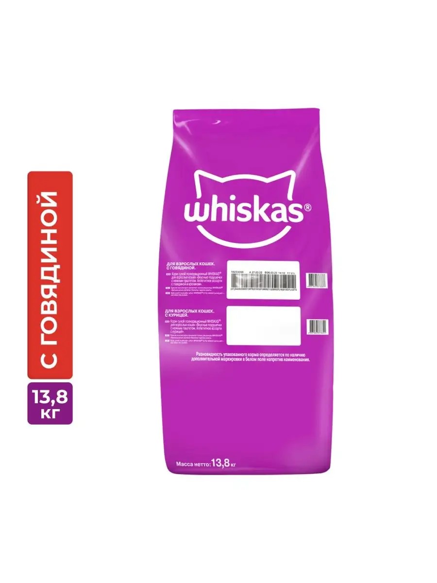 Whiskas cat food for adult cats of all breeds, kibble with beef pate, 13.8 kg. A delicious dinner, Whiskas is a 100% balanced diet for a healthy and happy life for your cat. Crispy kibble with a delicate pate inside is sure to please your pet. Furthermore, Whiskas contains everything necessary to ensure that your cat's food is not only tasty but also nutritious. Whiskas offers: An optimal combination of nutrients to support metabolism. Vitamin E and zinc for immunity. Omega-6 and zinc for healthy skin and coat. A balance of calcium and phosphorus for healthy bones. Vitamin A and taurine for good vision. Highly digestible ingredients and fiber for digestion. The dry texture of the food helps remove plaque. The Whiskas brand recommends combining different food formats in your cat's diet. Your pet should be fed wet food in the morning and evening, and dry food during the day. This will combine the benefits of each format, as their diet should be not only tasty but also nutritious. It's important to remember that mixing dry and wet food in the same bowl is not recommended. Your pet should also always have access to clean drinking water. WHISKAS diets contain all the necessary vitamins and minerals, proteins, fats, and carbohydrates to support your cat's health from head to tail. Ingredients: cereals and grain by-products, animal meal (including beef), plant protein extracts, animal fats and vegetable oils (including sunflower oil), hydrolyzed animal products, minerals, vitamins, beet pulp, brewer's yeast, amino acids (including taurine), colorings, dried carrots, antioxidants. Nutritional content (100 g): protein - 35 g; fat - 11.5 g, ash - 8.5 g; fiber - 1.5 g, moisture - no more than 10 g; vitamin A - 600 IU, vitamin E - 7.3 mg, calcium - 1.2 g, phosphorus - 1 g. Energy value (100 g): 368 kcal / 1540 kJ.