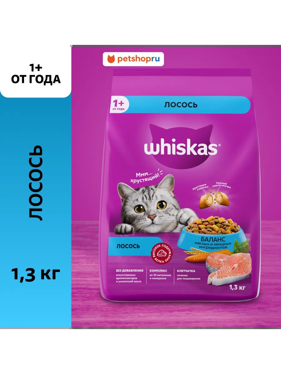 WHISKAS Корм сухой для кошек, с лососем, 1.3кг