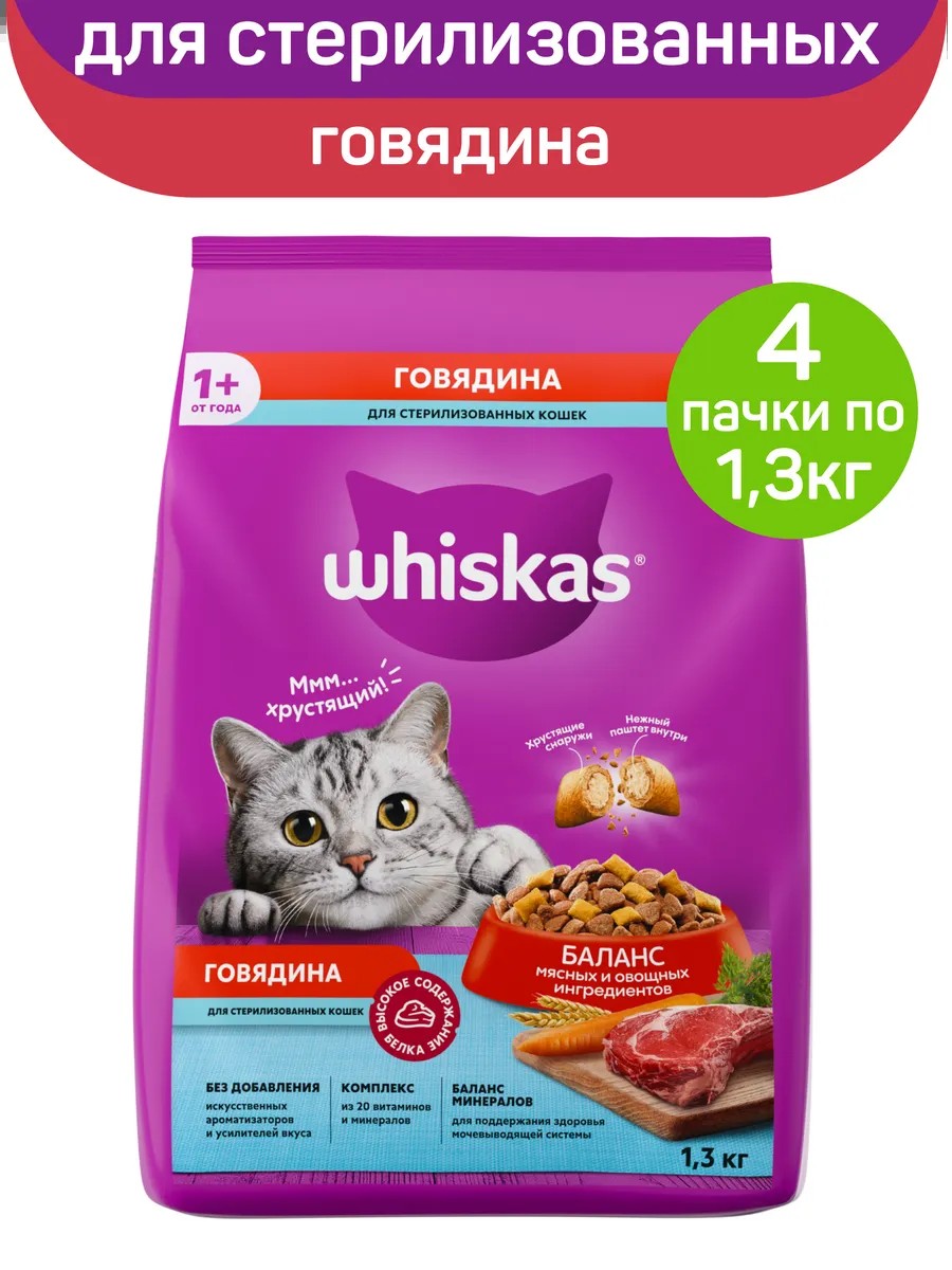 WHISKAS Сухой корм для стерилизованных кошек, говядина, 4шт по 1.3кг