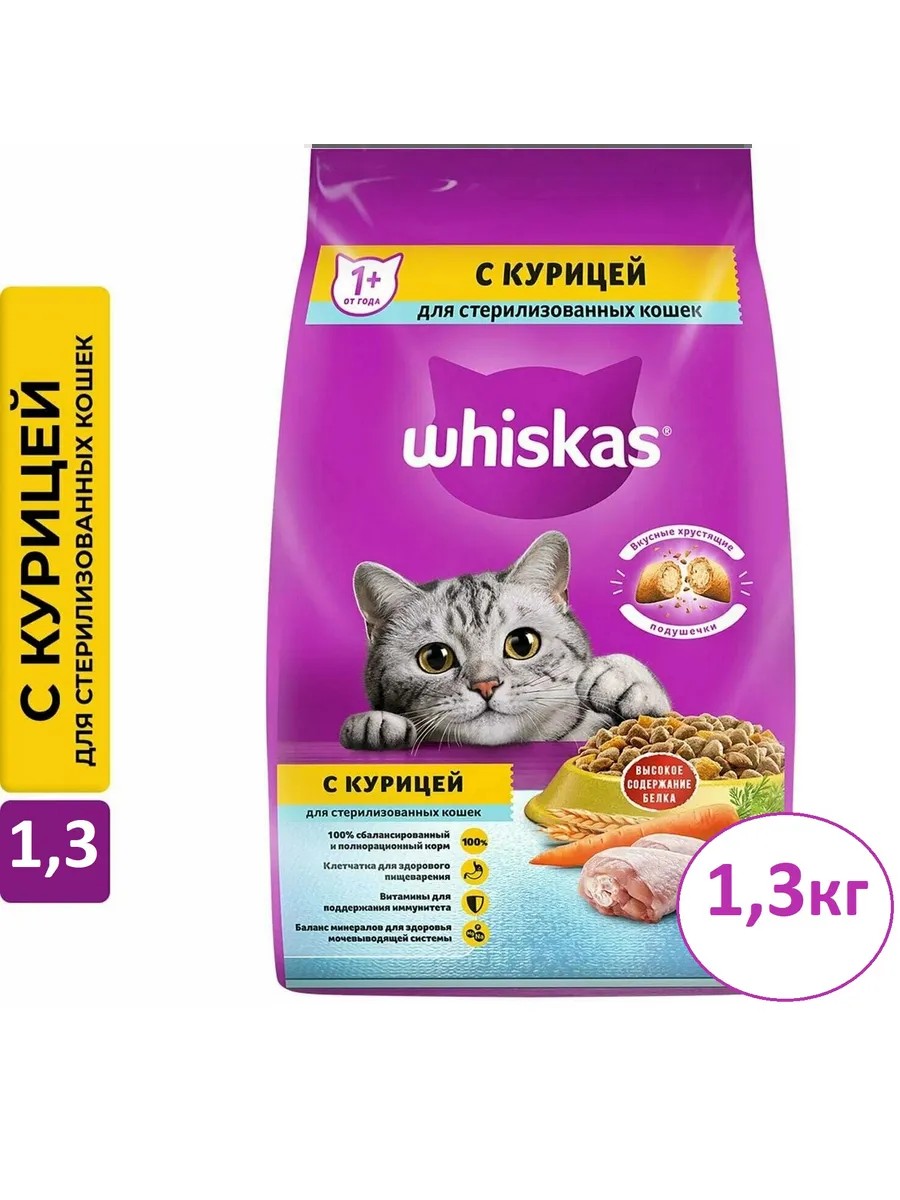 WHISKAS Для стерилизованных кошек подушечки с курицей 1,3 кг